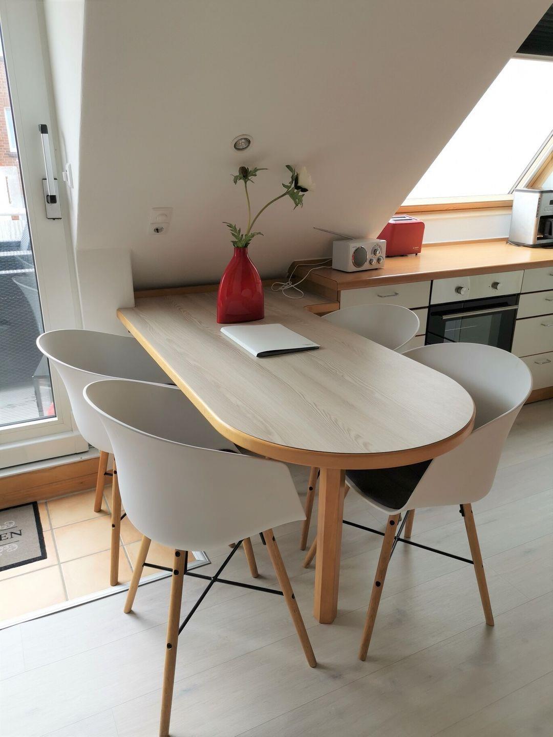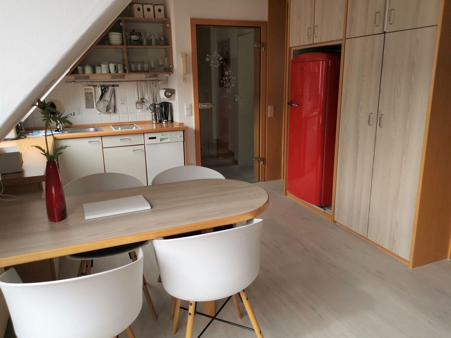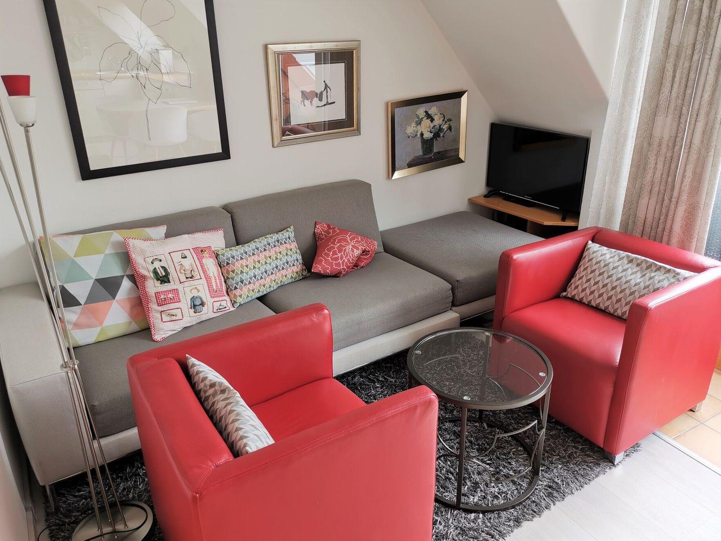 Die lichtdurchflutete Studiowohnung in der 2. Etage verfügt über zwei separate Schlafräume, ein Schlafzimmer mit Boxspring-Doppelbett und ein Kinderzimmer mit Schlafsofa, Liegefläche 136 x 200 cm/ Höhe 39 cm, und TV, einen offenen Wohnraum mit TV, Essplatz und gut ausgestatteter Küche mit Spülmaschine, Backofen, 2-Plattenherd und großem Kühlschrank mit Gefrierfach. Vom Wohnraum aus ist der Zugang zum Südwest-Balkon mit Loungemöbeln und Markise. Badezimmer mit Dusche und WC. WLAN. NICHTRAUCHERWOHNUNG!