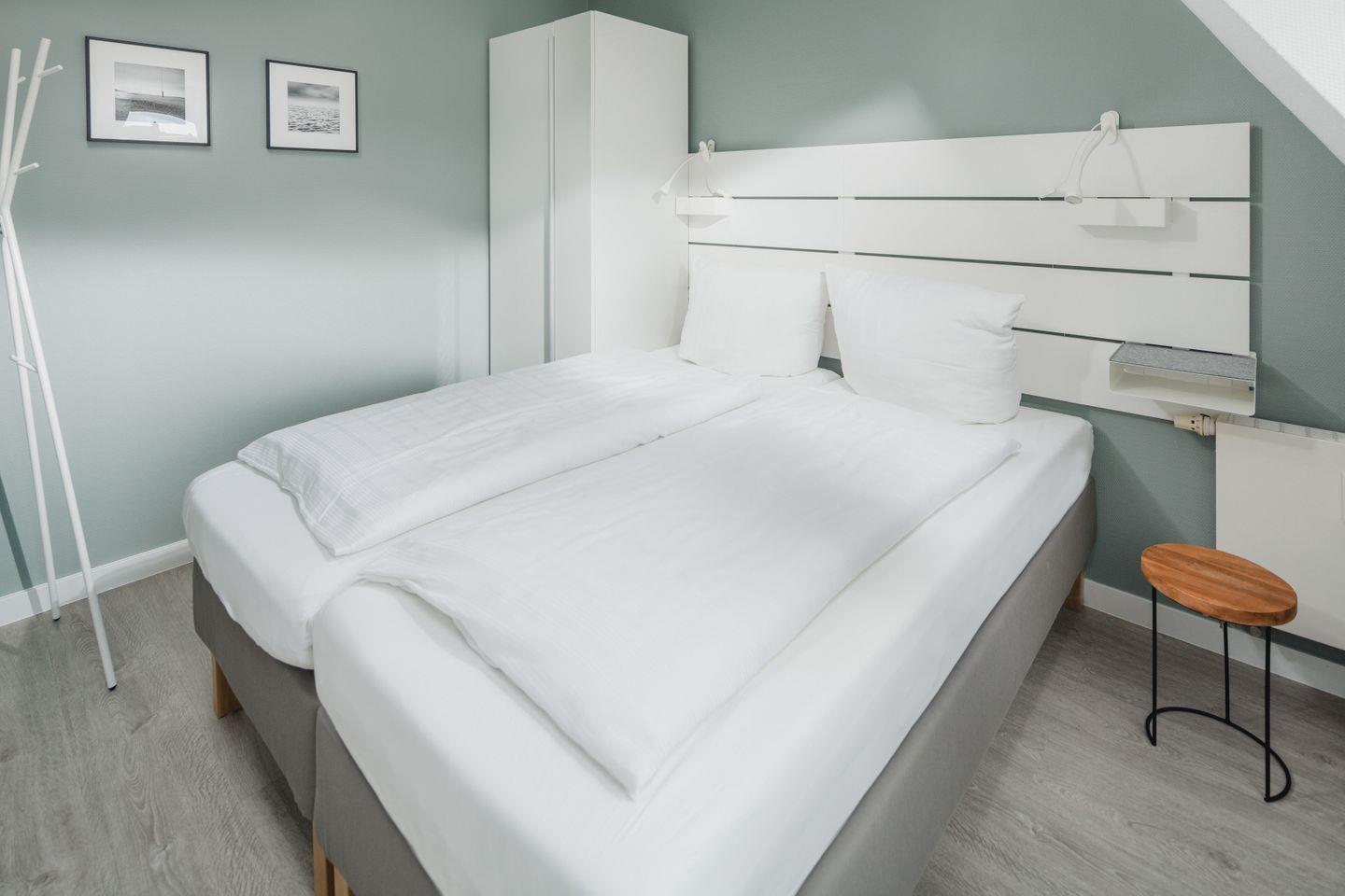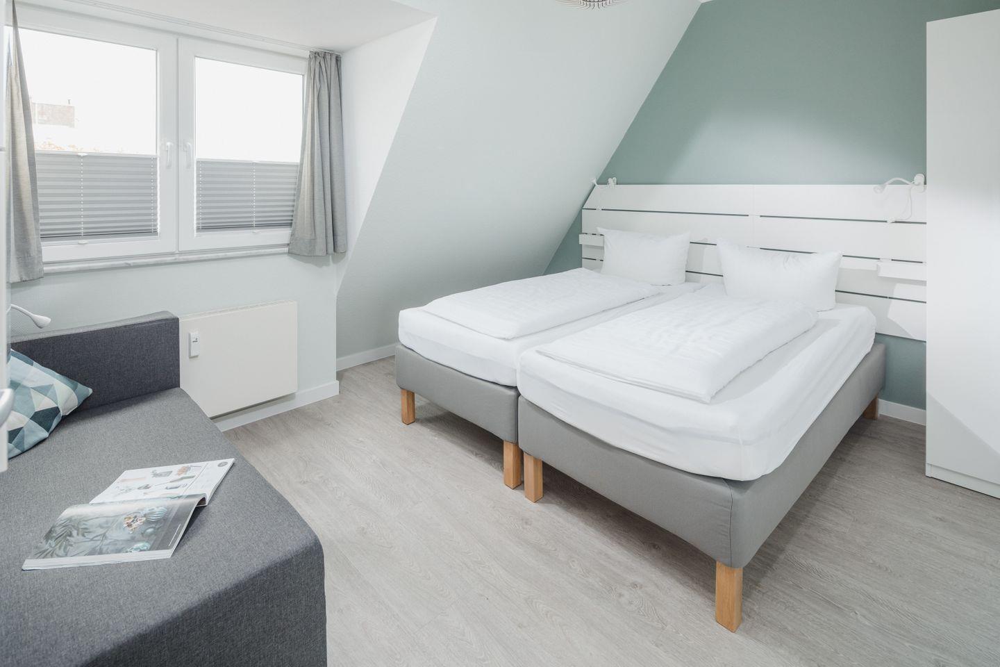 Angeschlossen ist ein Schlafzimmer mit Doppelbett. Die voll ausgestattete Küche verfügt, unter anderem, über einen Herd mit Backofen, Spülmaschine und Mikrowelle. Im geräumigen Tageslichtbad mit Dusche können Sie bequem Ihre Badesachen trocknen. Das Doppelbett im größeren Schlafzimmer verwandelt sich mit wenigen Handgriffen in zwei Einzelbetten. Eine Recamiere bietet hier als Schlafcouch Platz für eine weitere Person. Beide Schlafzimmer haben ein eigenes TV.