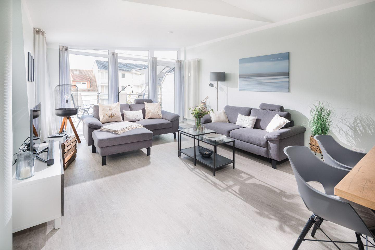 Ihr Feriendomizil, die "Sonne 12", befindet sich im darüberliegenden DG. Durch den Flur, mit reichlich Platz für Ihre Garderobe, gelangen Sie in den großzügigen, luftigen und sonnendurchfluteten Wohn/Essbereich mit Zugang zum nach Süd/West ausgerichteten Balkon. Der moderne & bequeme Wohnbereich verfügt außerdem über modernste Fernsehunterhaltung (LG Smart-TV mit zahlreichen Apps wie Netflix, Amazon Prime, SkyQ u.v.m.).