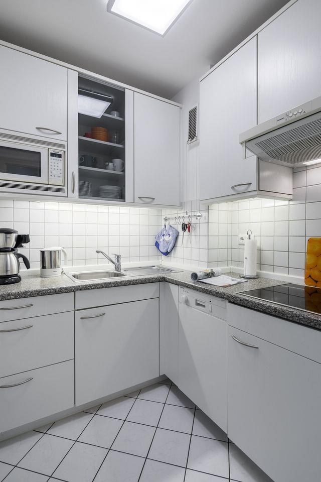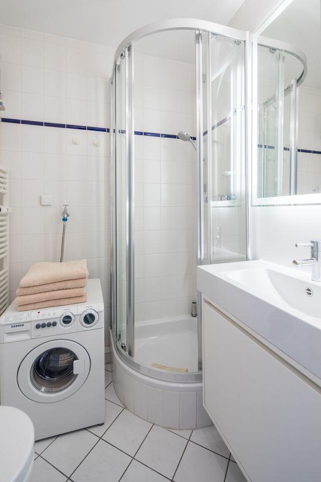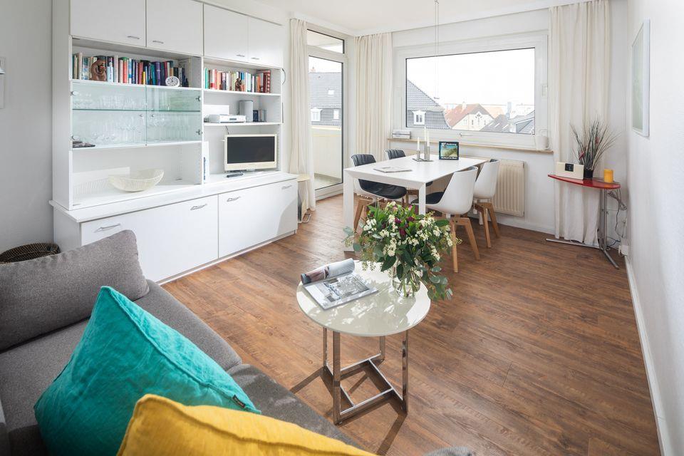 Die helle, renovierte 2-Raum-Ferienwohnung (ca.35qm²) in der 3. Etage verfügt über ein separates Schlafzimmer mit Doppelbett, einen Wohn-Schlafraum (komfortables Faltsofa) mit Essecke (Smart-TV, Bluetooth-Radio), separate Küche (4-Plattenherd, Spülmaschine, Mikrowelle, Nespressomaschine) und Badezimmer mit Dusche/ WC. Im Badezimmer steht Ihnen eine Waschmaschine zur Verfügung. Hauseigenes Schwimmbad vorhanden. NICHTRAUCHERWOHNUNG !