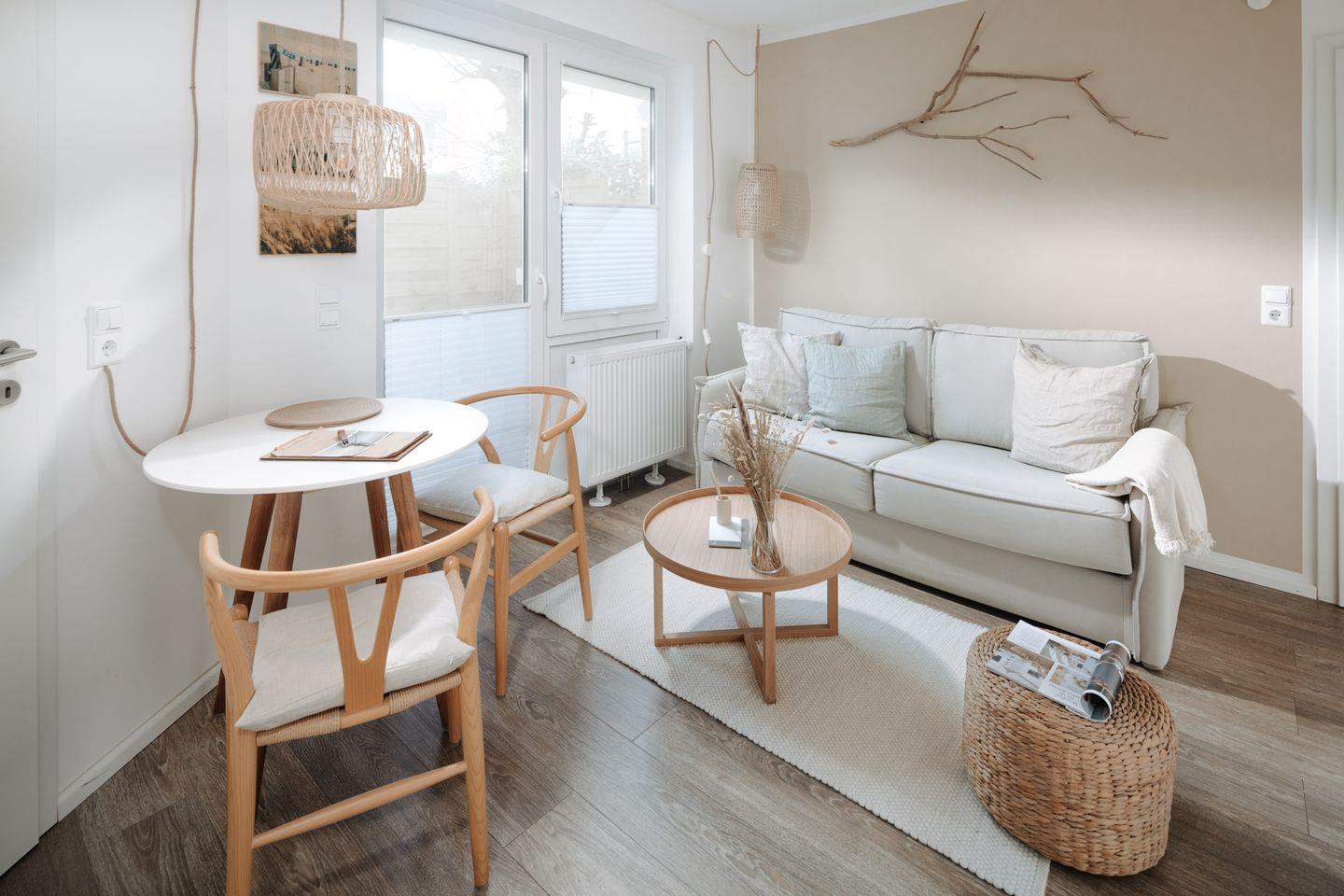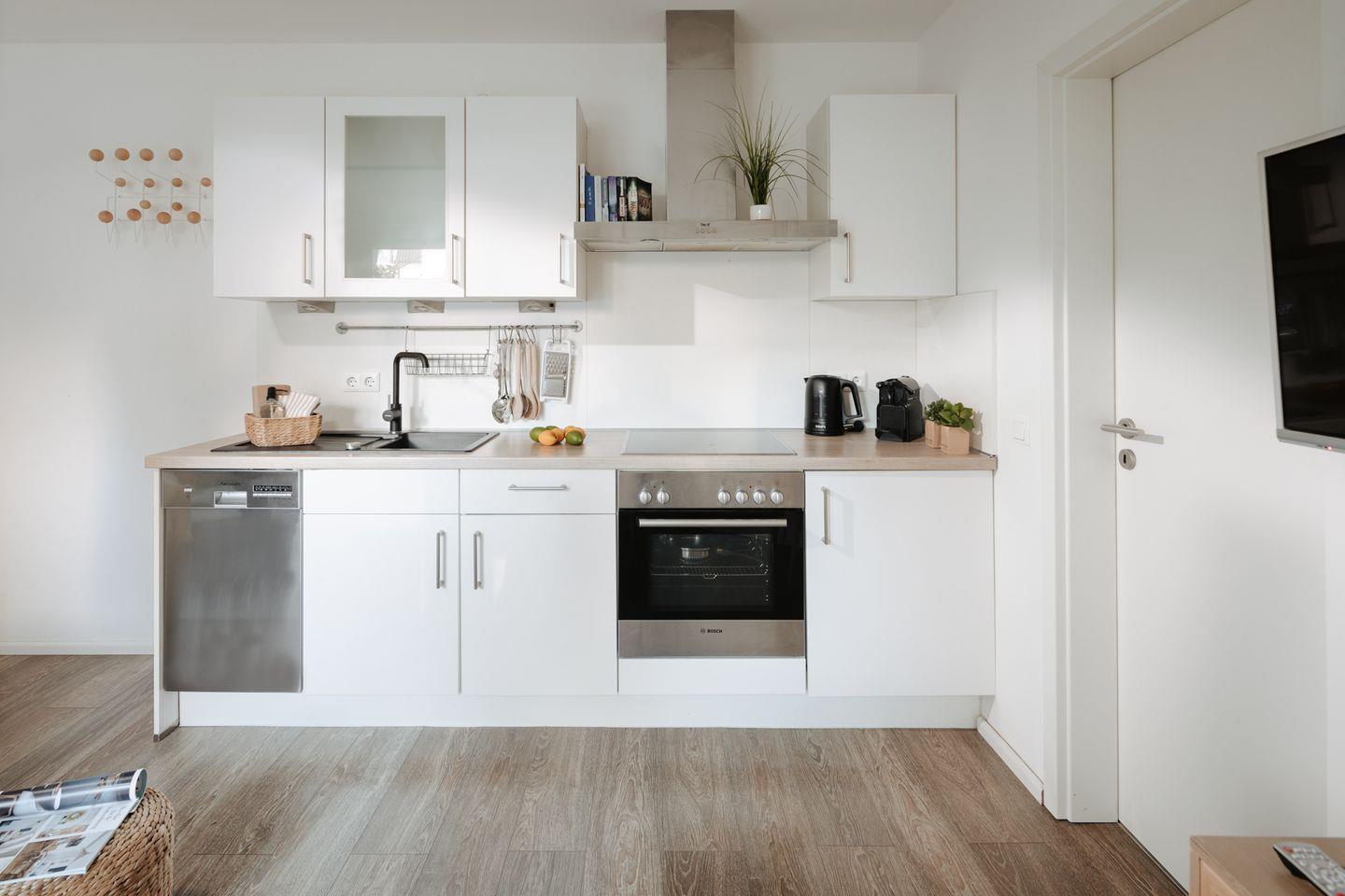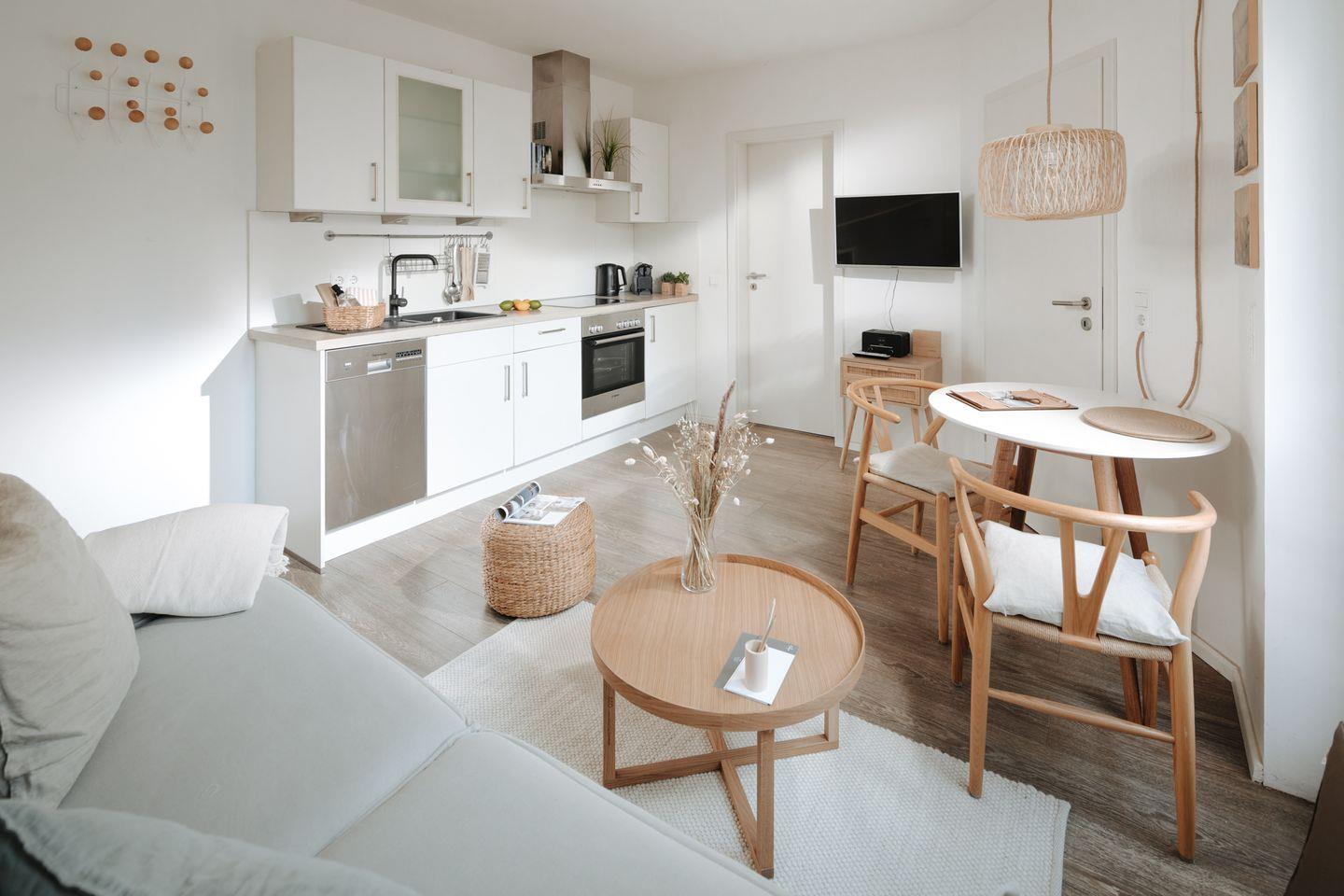 Die Wohnung besticht durch ihren skandinavischen und gemütlichen Stil, der eine warme Atmosphäre schafft. Das Wohnzimmer mit integrierter Küche lädt zum Verweilen ein und ist mit liebevollen Details gestaltet. Die voll ausgestattete Küche lässt keine Wünsche offen und verfügt über eine Spülmaschine, ein Ceranfeld, einen Kühlschrank mit Gefrierfach, einen Backofen sowie eine Kaffeemaschine und eine Nespresso-Kapselmaschine – perfekt für alle, die gerne kochen oder einfach nur eine Tasse Kaffee genießen möchten.