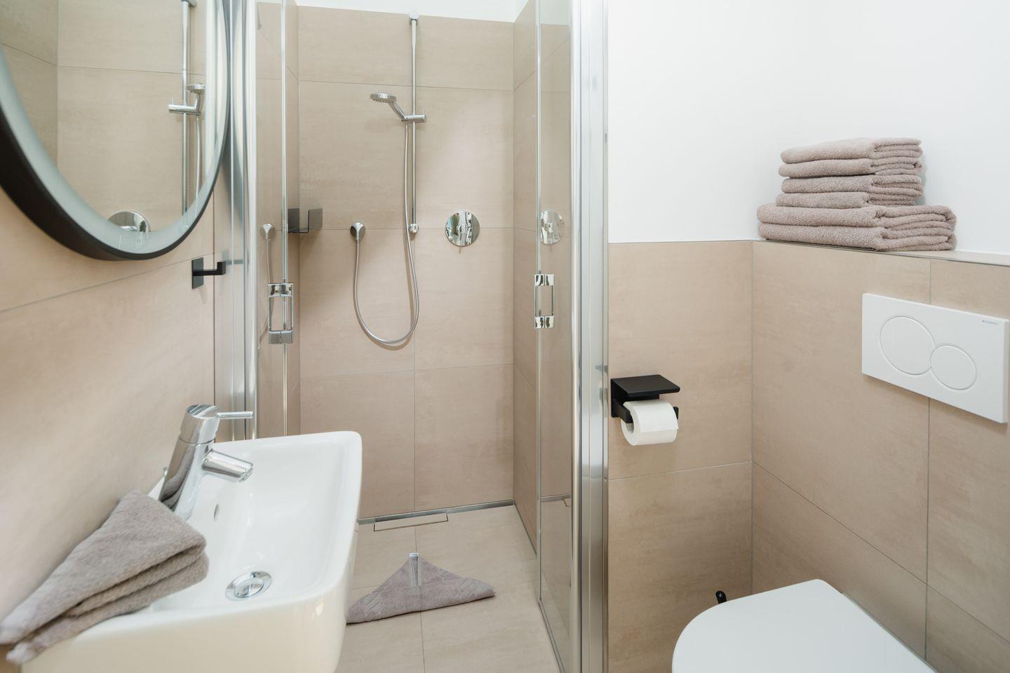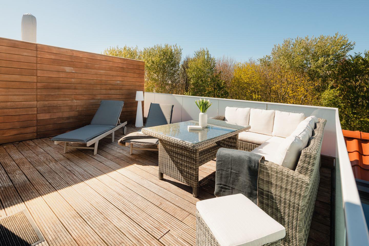Die Wohnung besteht aus einem großzügigen Wohn-und Essbereich mit integrierter Küche, 2 komfortablen Schlafzimmern mit einem Doppelbett (180x200cm) und einem Einzelbett (90x200cm), sowie 2 vollwertigen Badezimmern, bestehend aus Dusche, Waschbecken und Toilette. Auf der großen sonnigen Dachterrasse lässt sich das schöne Wetter bei einem Glas Wein oder einer Tasse Kaffee genießen. Auch ein Reisebett und ein Hochstuhl stellen wir für die kleinen Gäste gern kostenlos zur Verfügung.