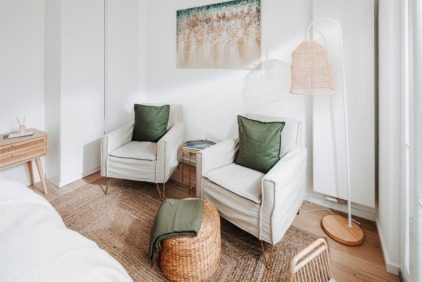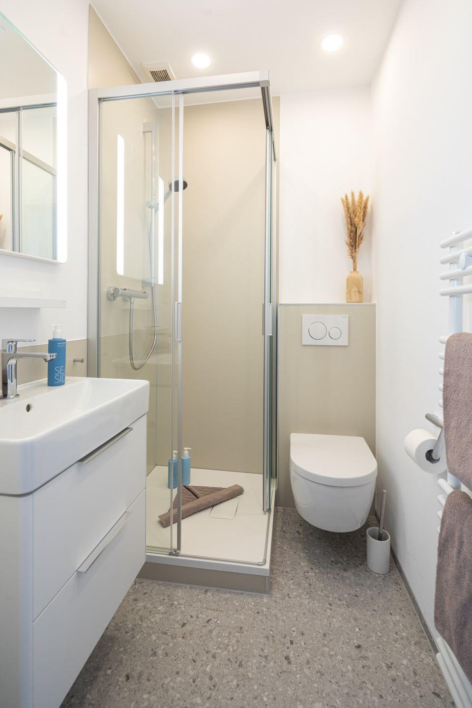 Das Apartment verfügt über ein kombiniertes Wohn- und Schlafzimmer, in dem ein komfortables Boxspringbett der Größe 160x200cm für erholsame Nächte sorgt. Das Badezimmer ist mit einer Dusche, Waschbecken sowie einer Toilette ausgestattet.
