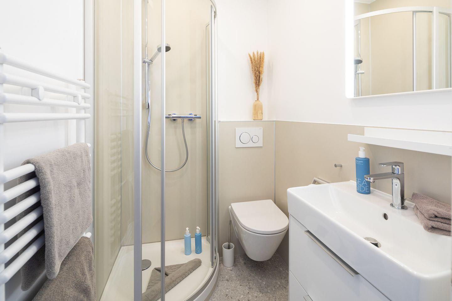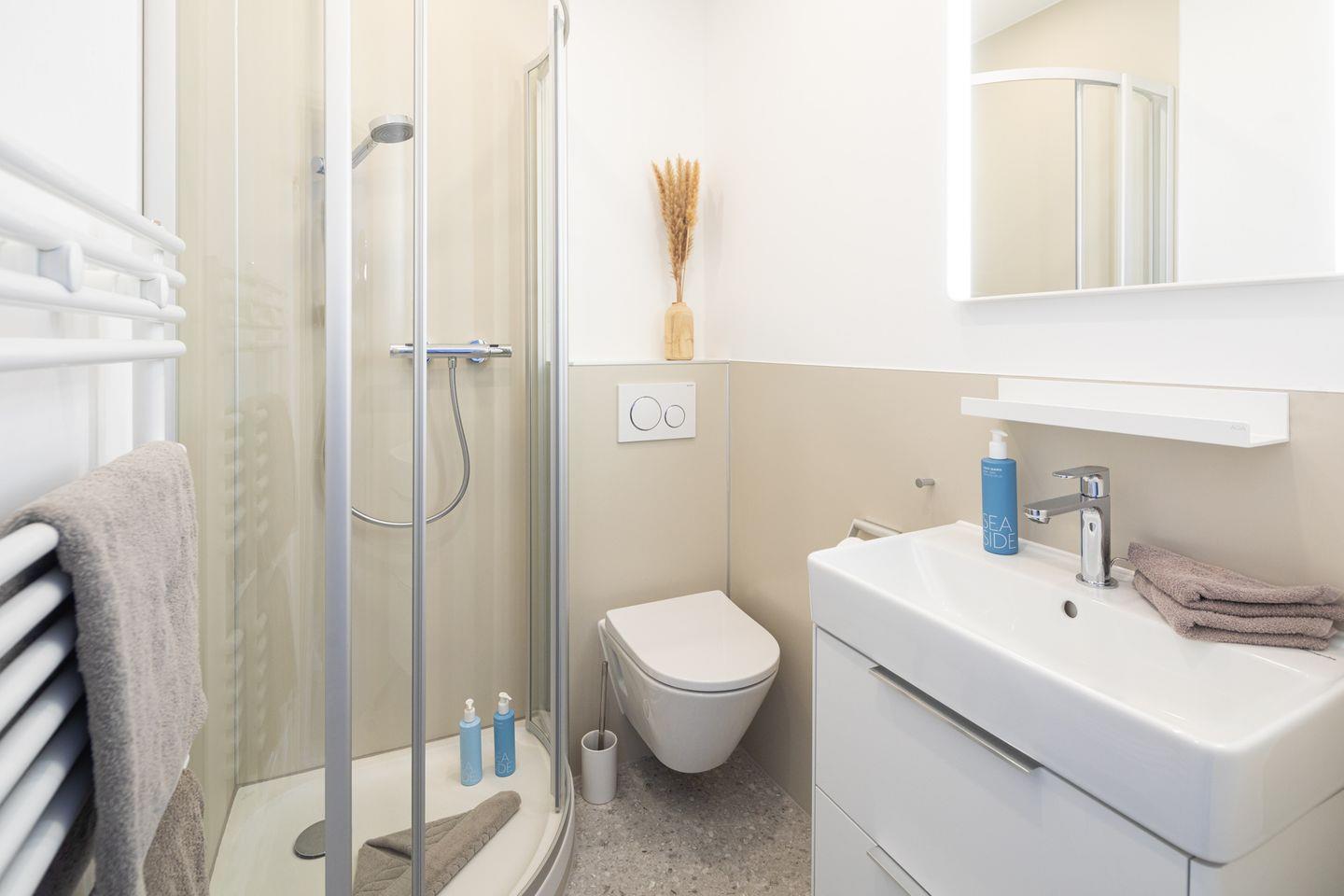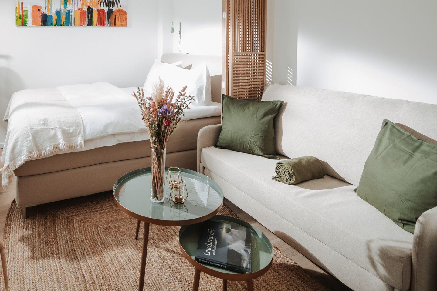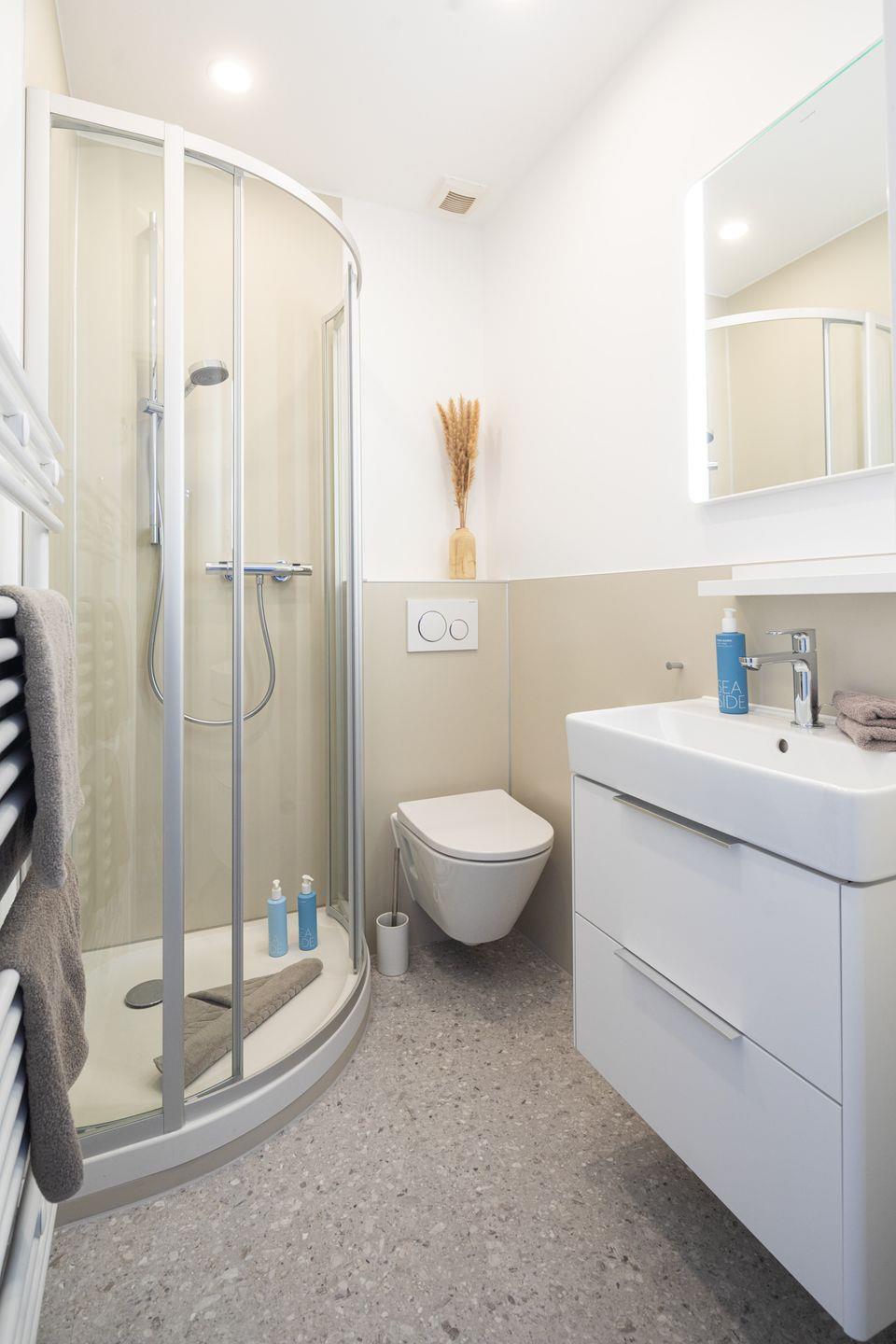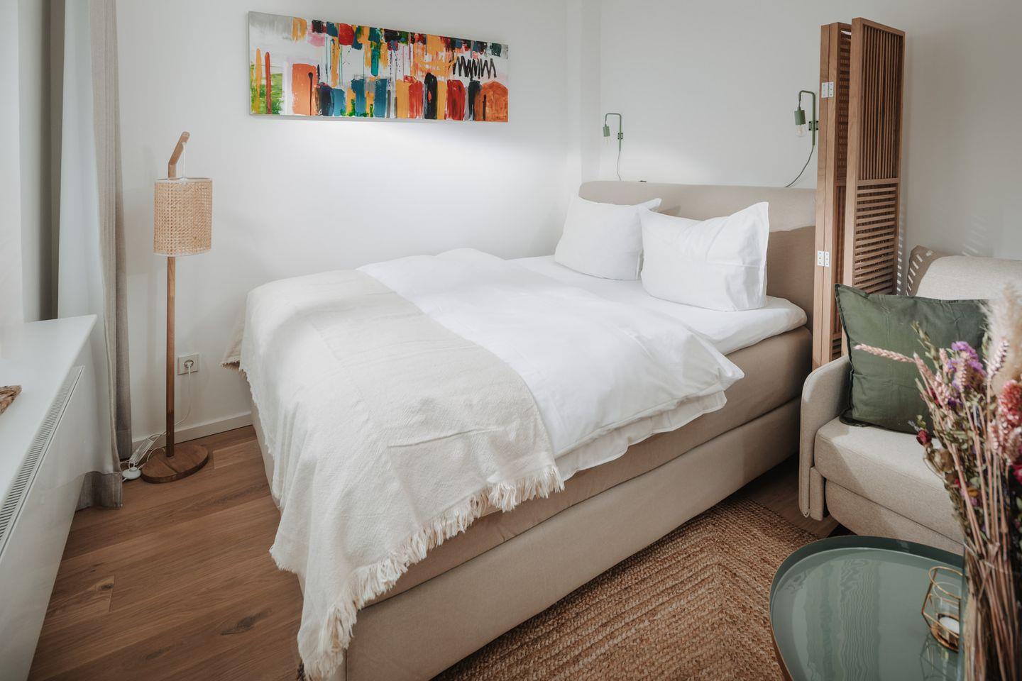 Das Apartment verfügt über ein kombiniertes Wohn- und Schlafzimmer, in dem ein komfortables Boxspringbett der Größe 160x200cm für erholsame Nächte sorgt. Das Badezimmer ist mit einer Dusche, Waschbecken sowie einer Toilette ausgestattet.
