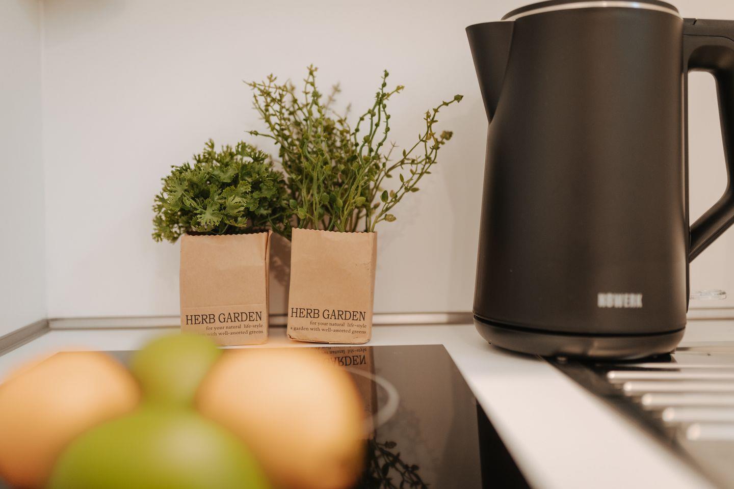Die offene kleine Küche ist trotz des eingeschränkten Platzes bestens mit einem Kühlschrank, Gefrierfach, Mikrowelle, Ceranfeld (2 Kochfelder), Kaffeemaschine und einer Nespresso-Kapselmaschine ausgestattet, um Ihren Aufenthalt so angenehm wie möglich zu gestalten.