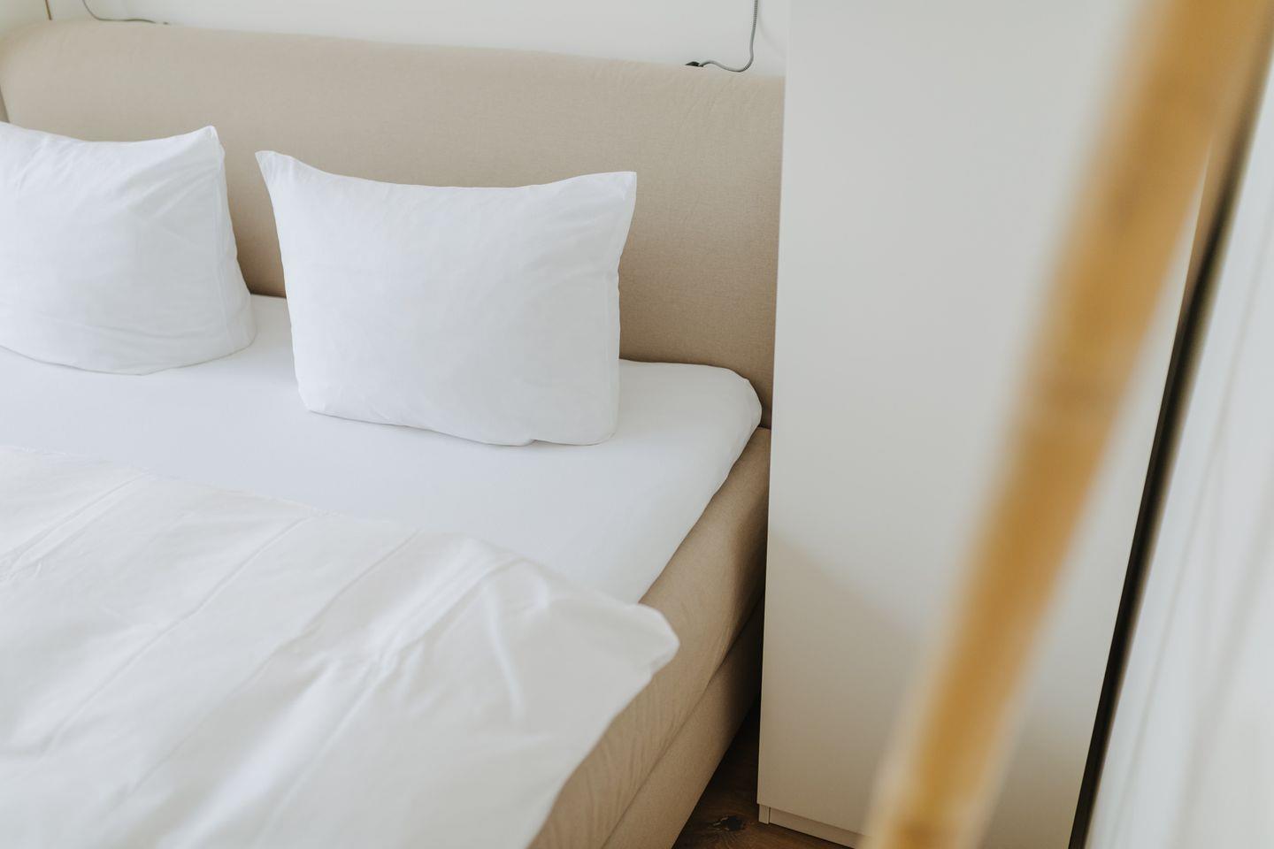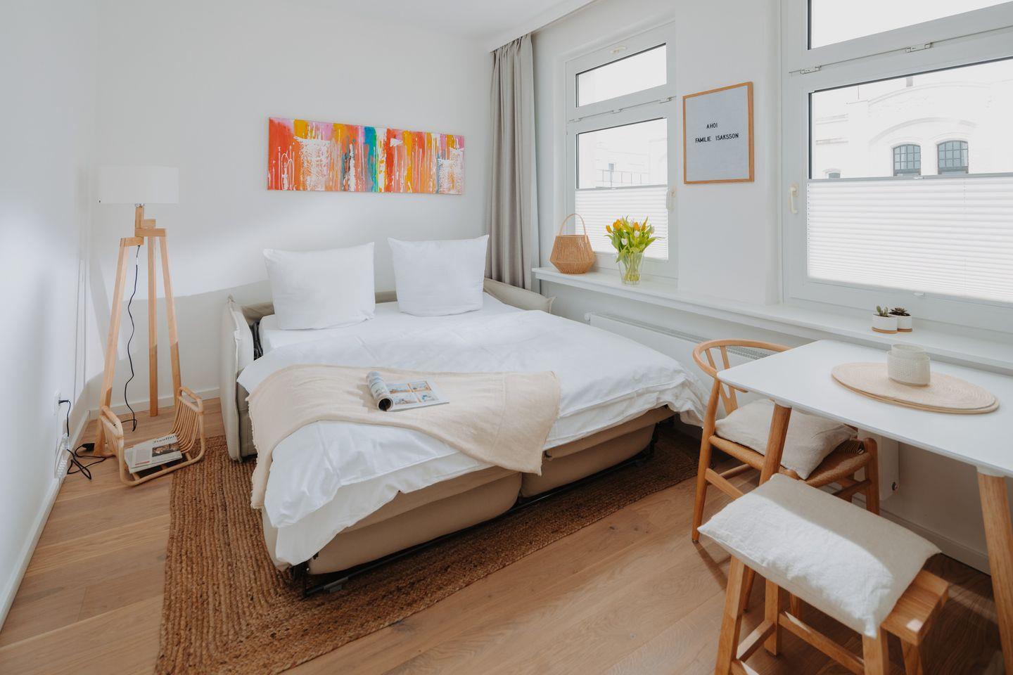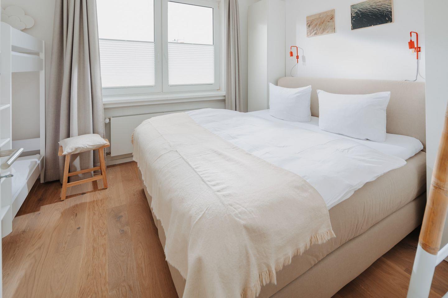 Die Wohnung verfügt über ein Schlafzimmer mit einem großzügigen Boxspringbett der Größe 180x200cm, das höchsten Schlafkomfort verspricht. Für die kleinen Gäste steht ein Etagenbett mit den Maßen 80x160 bereit, um einen erholsamen Schlaf zu gewährleisten. Das Badezimmer ist mit einer Dusche und einem Waschbecken ausgestattet. Das WC befindet sich separat.