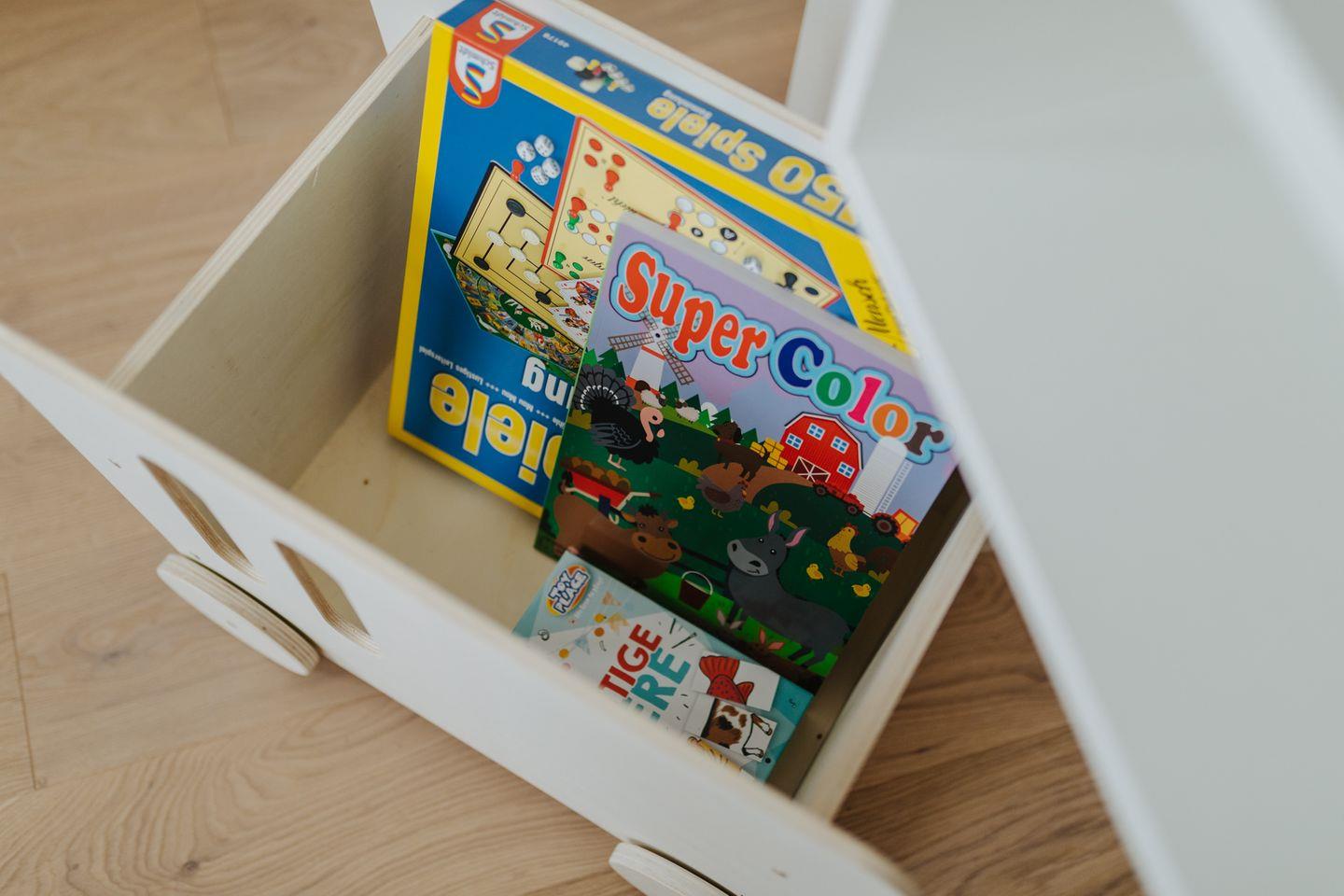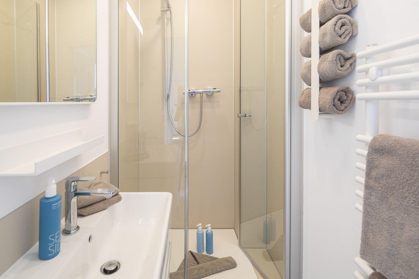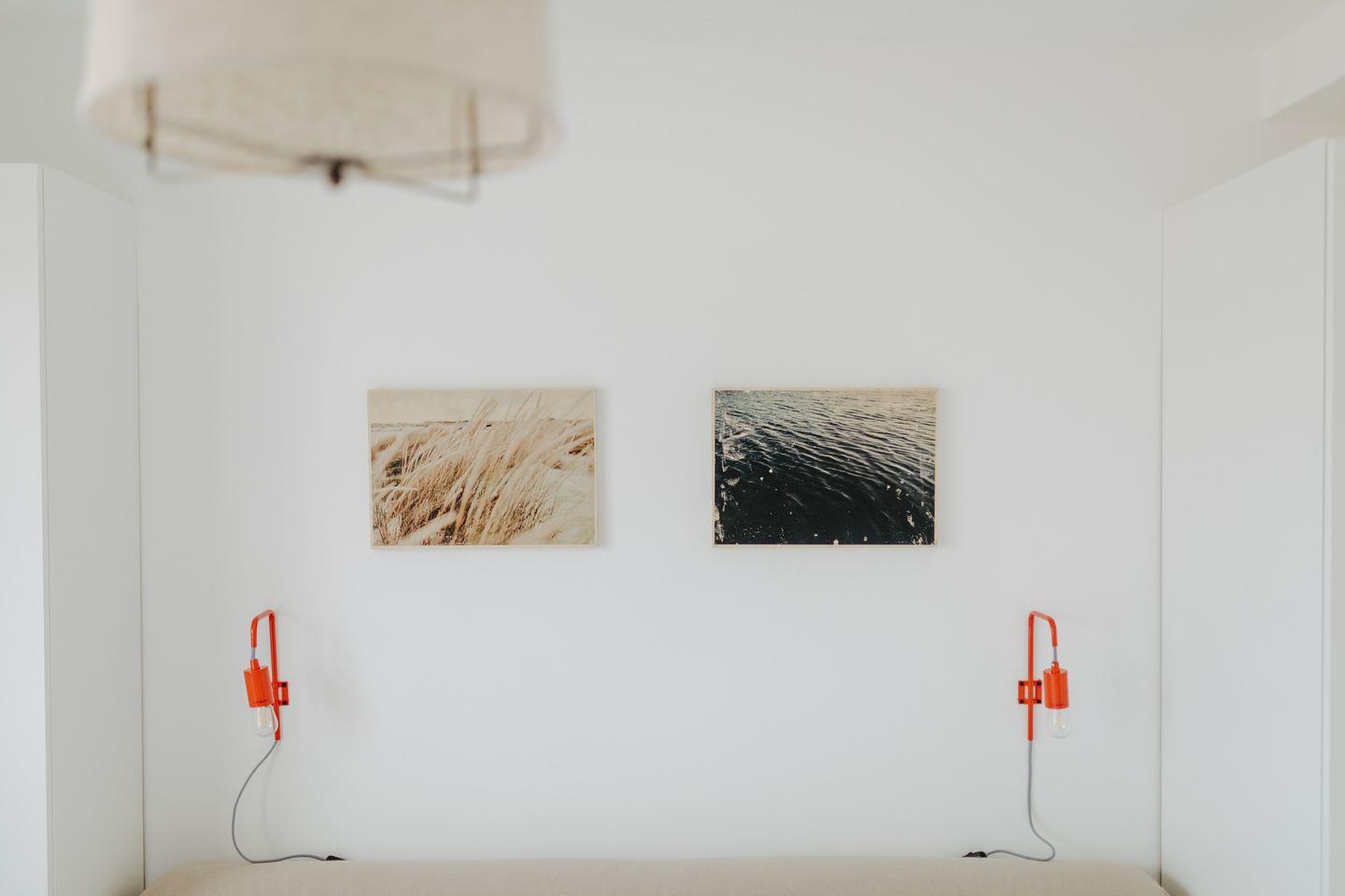 Die Wohnung verfügt über ein Schlafzimmer mit einem großzügigen Boxspringbett der Größe 180x200cm, das höchsten Schlafkomfort verspricht. Für die kleinen Gäste steht ein Etagenbett mit den Maßen 80x160 bereit, um einen erholsamen Schlaf zu gewährleisten. Das Badezimmer ist mit einer Dusche und einem Waschbecken ausgestattet. Das WC befindet sich separat.