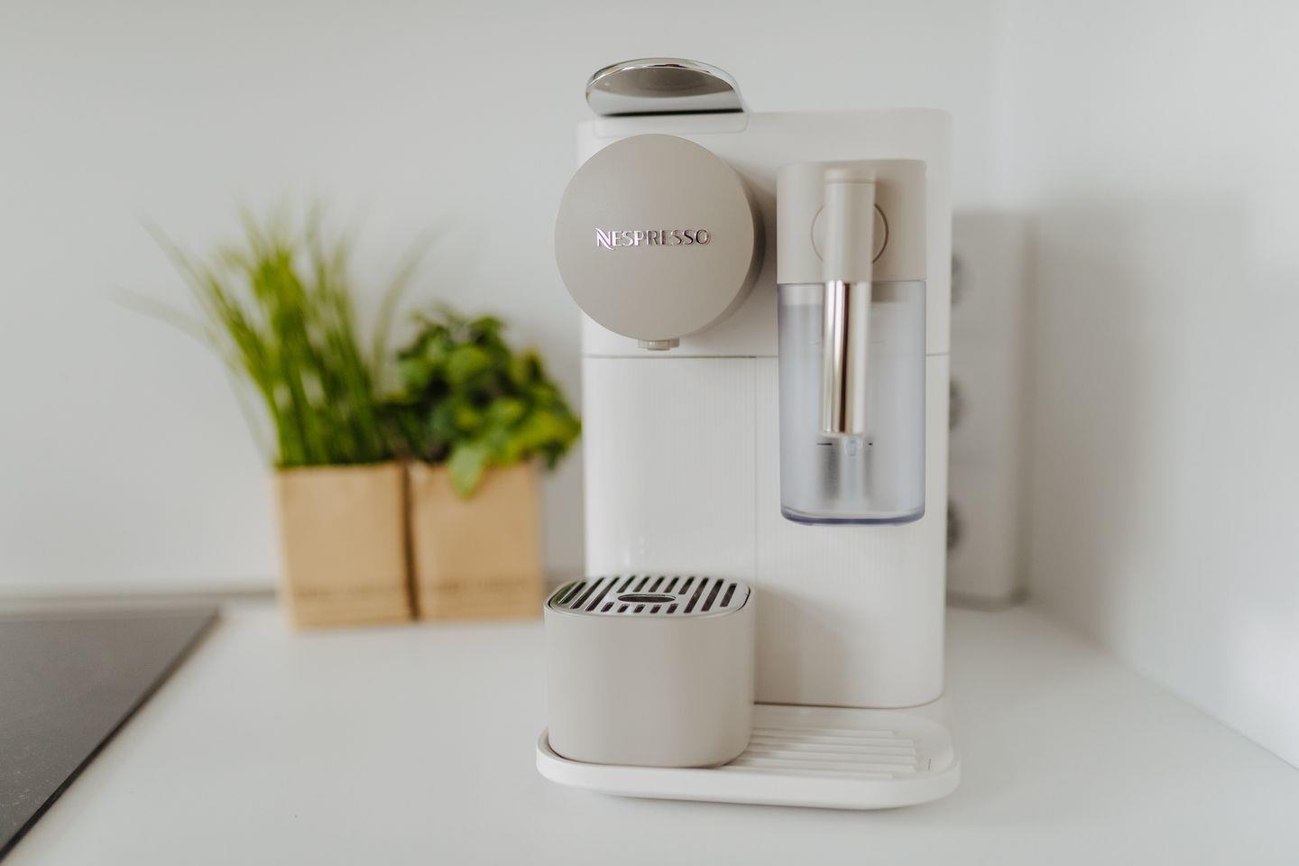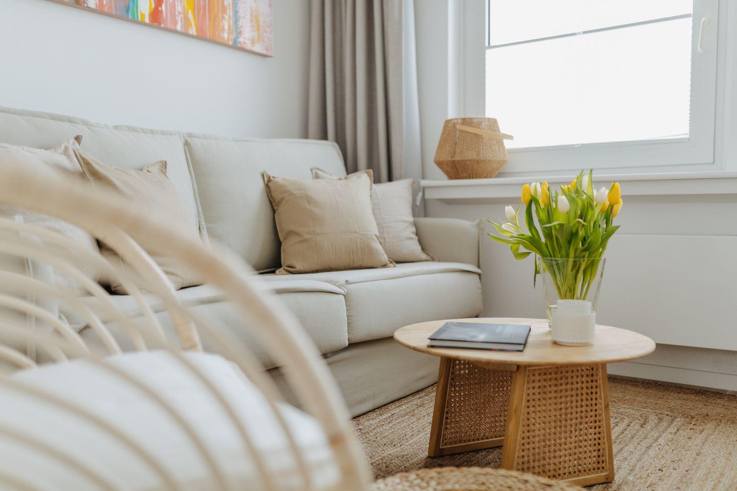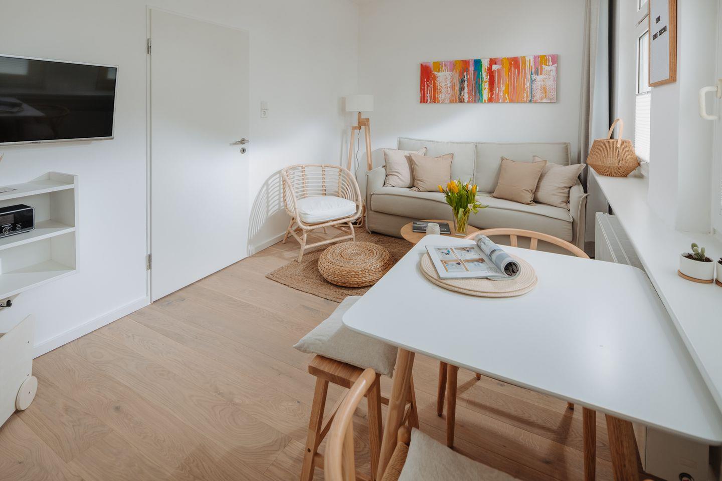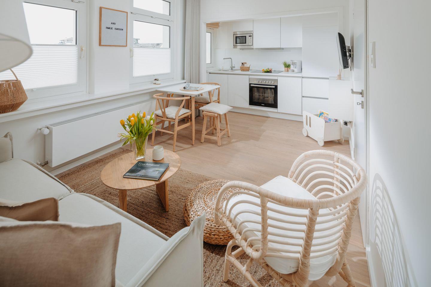 Im Wohnzimmer mit offener Küche erwartet Sie eine voll ausgestattete Küche mit Kühlschrank, Gefrierfach, Backofen, Mikrowelle, Ceranfeld, Kaffeemaschine und einer Nespresso-Kapselmaschine. Der Fernseher lädt zu gemütlichen Abenden ein, während der skandinavische Einrichtungsstil eine besondere Wohlfühlatmosphäre schafft.