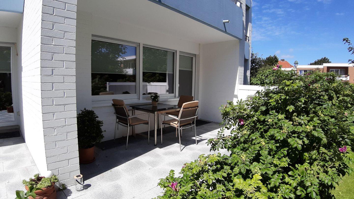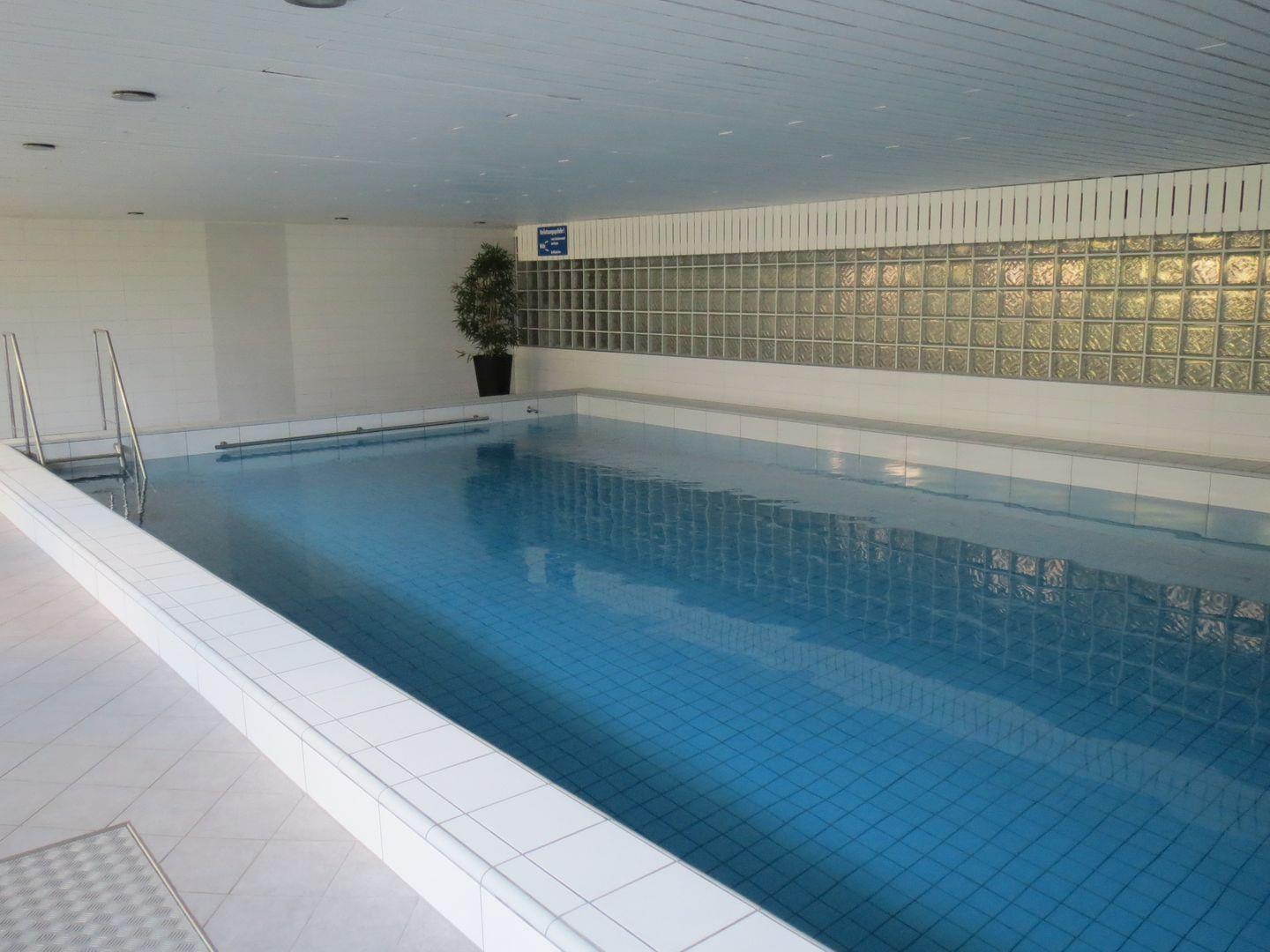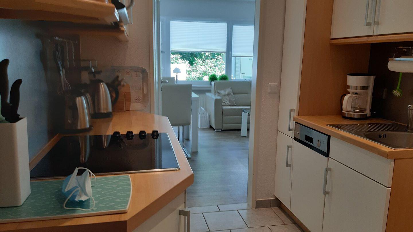 Freundliche 2-Zimmer-EG-Wohnung mit 2 Terrassen, kl. Küche (4-Zonen-Cerankochfeld, Dunstabzugshaube, Kühlschrank, Spülmaschine, Kaffeemaschine, Wasserkocher, Toaster und Mikrowelle). Für Allergiker geeignet. Der Wohnraum mit Ledergarnitur (ausziehbares Schlafsofa für 1 Person) und Essecke, Flachbildschirm-FS mit Stereoanlage, ein 2. Flachbildschirmfernseher befindet sich im Schlafzimmer an der Wand. Dort gibt es 1 Doppelbett und 1 große Schrankwand. Das Bad hat eine begehbare Dusche, ebenso können Sie im hauseigenen Schwimmbad mit Münzsauna und Ruheräumen duschen. Im Keller sind Waschmaschine und Trockner für Sie da. Die Wohnung ist ebenerdig und hat 2 große Terrassen. Dort können Sie schon morgens in der Sonne frühstücken, und auf der 2. Terrasse können sie sich bis nachmittags sonnen.