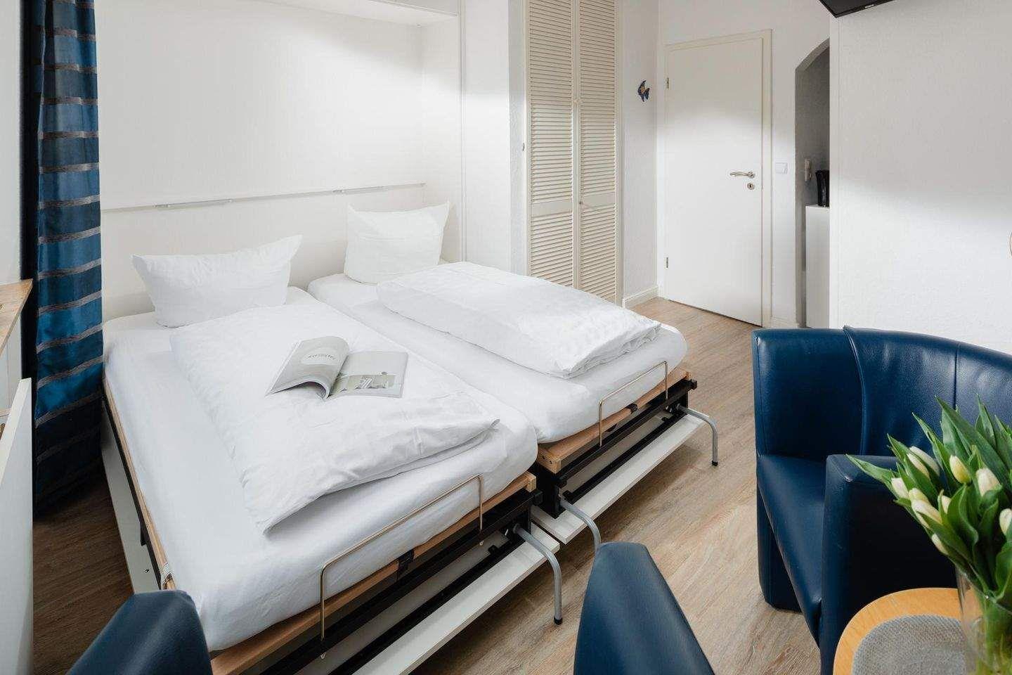 Die kleine 1-Raum-Ferienwohnung (22qm²) im Erdgeschoss verfügt über ein Wohn-/Schlafraum mit Schrankbetten (TV), Pantryküche (2-Platten-Herd, Kühlschrank mit Gefrierfach) sowie separates Badezimmer mit Dusche/ WC. Nichtraucherwohnung!