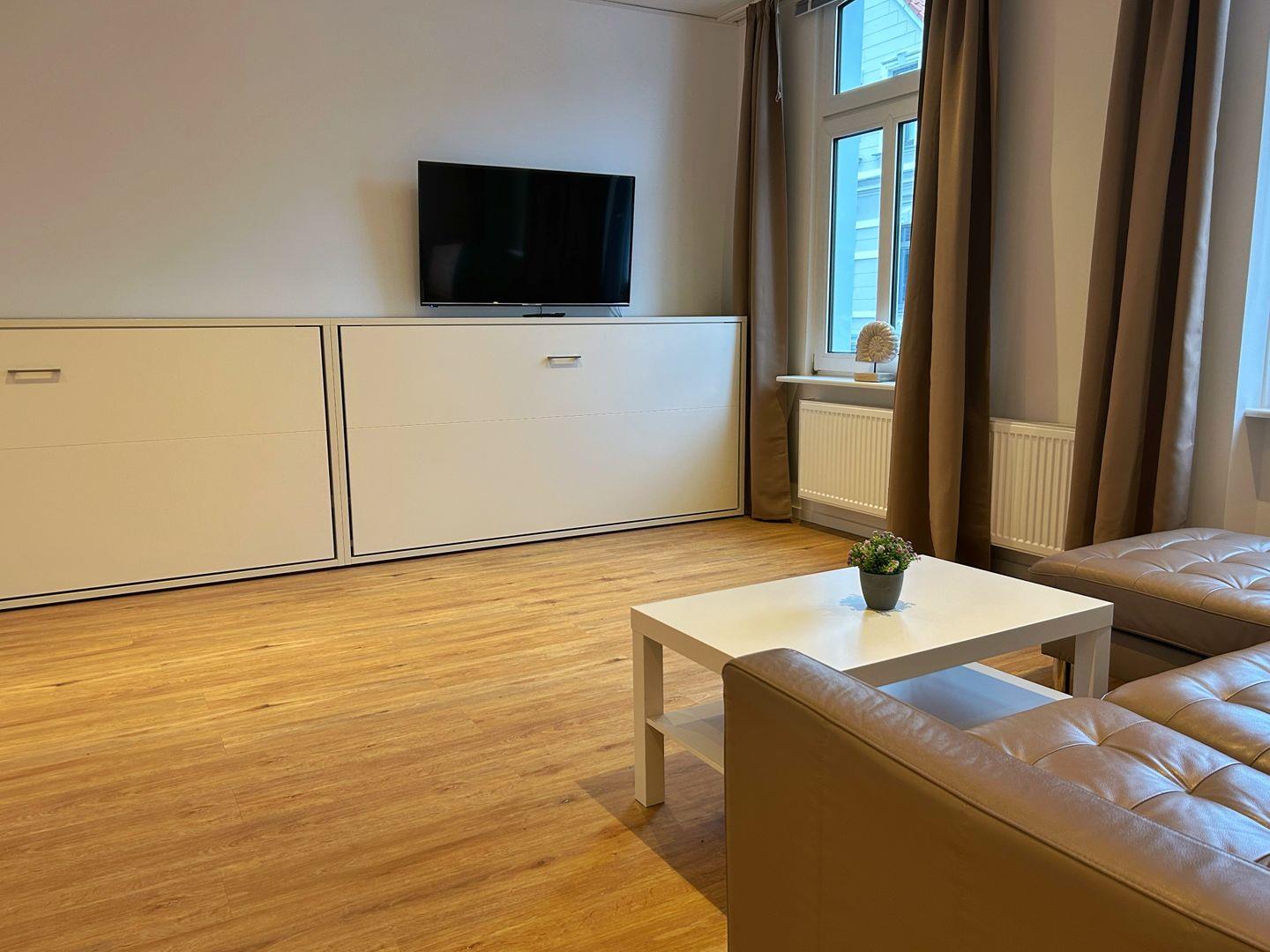 Die gemütliche 2-Raum-Ferienwohnung (1. OG) im Stadtzentrum verfügt über einen großzügigen, renovierten Wohn-/Schlafraum mit zwei Schrankbetten, Sofaecke mit TV sowie moderner Küchenzeile (Backofen, Spülmaschine, Ceranfeld) und Essbereich. Vom Flur erreicht man das separate Schlafzimmer mit Doppelbett (TV) sowie das neu-renovierte Badezimmer mit Dusche/ WC. NICHTRAUCHERWOHNUNG! Kostenfreies WLAN steht zur Verfügung.
