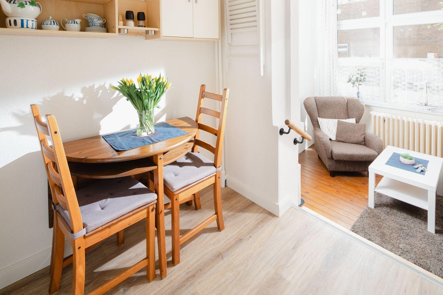Der Wohnbereich ist hell und freundlich gestaltet und sogleich der Eingangsbereich. Für Unterhaltung sorgen Fernseher mit Satellitenanschluss, ein CD-Spieler und eine Auswahl an Büchern sowie Spielen, die besonders die kleinen Gäste begeistern. WLAN ist in der gesamten Wohnung verfügbar, damit Sie auch im Urlaub immer online bleiben können.