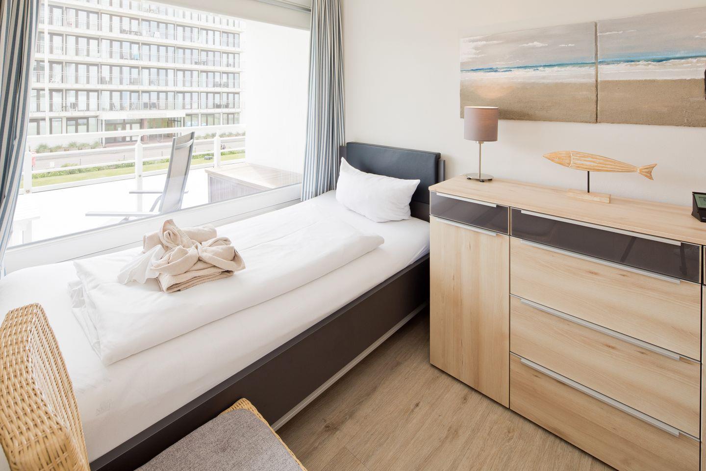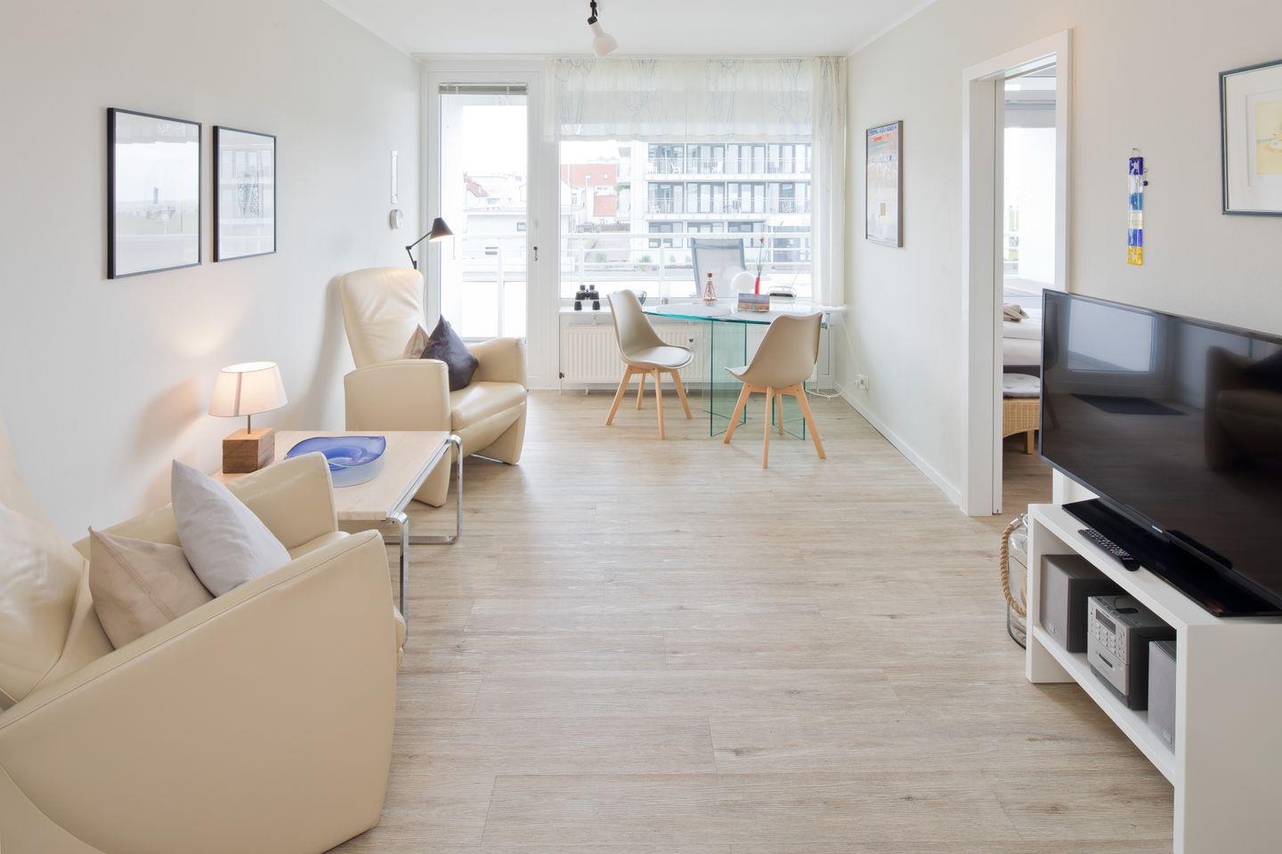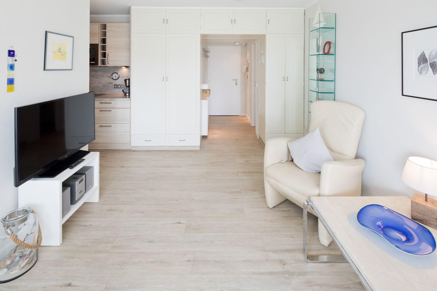 Das helle und freundliche Wohnzimmer ist mit zwei Sesseln ausgestattet und bietet einen angenehmen Rückzugsort. Das Schlafzimmer verfügt über zwei Einzelbetten, die für eine erholsame Nachtruhe sorgen.