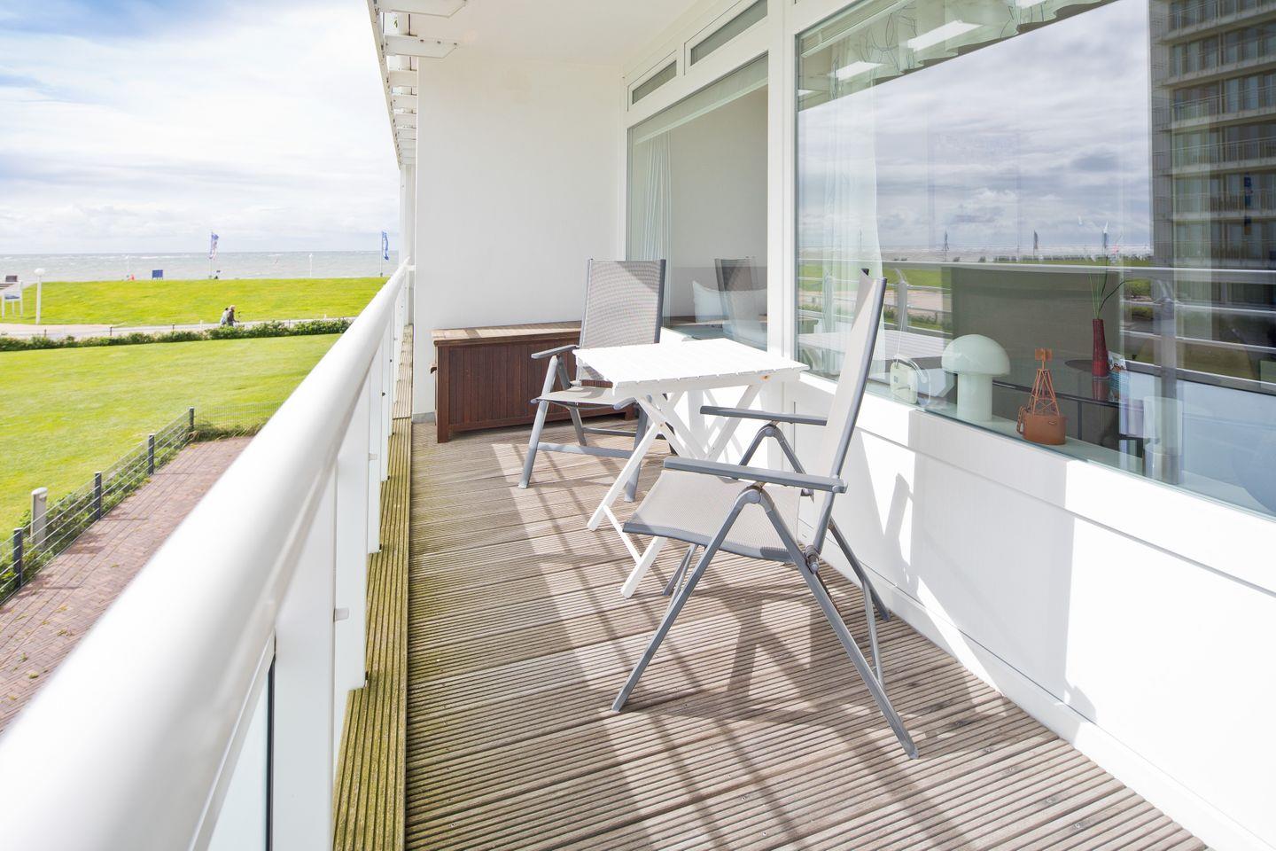 Der Sonnenbalkon mit West-Ausrichtung ermöglicht es Ihnen, die Sonnenuntergänge über der Nordsee zu bewundern. Die Lage im 1. Stock gewährleistet eine beeindruckende Aussicht auf das Meer.