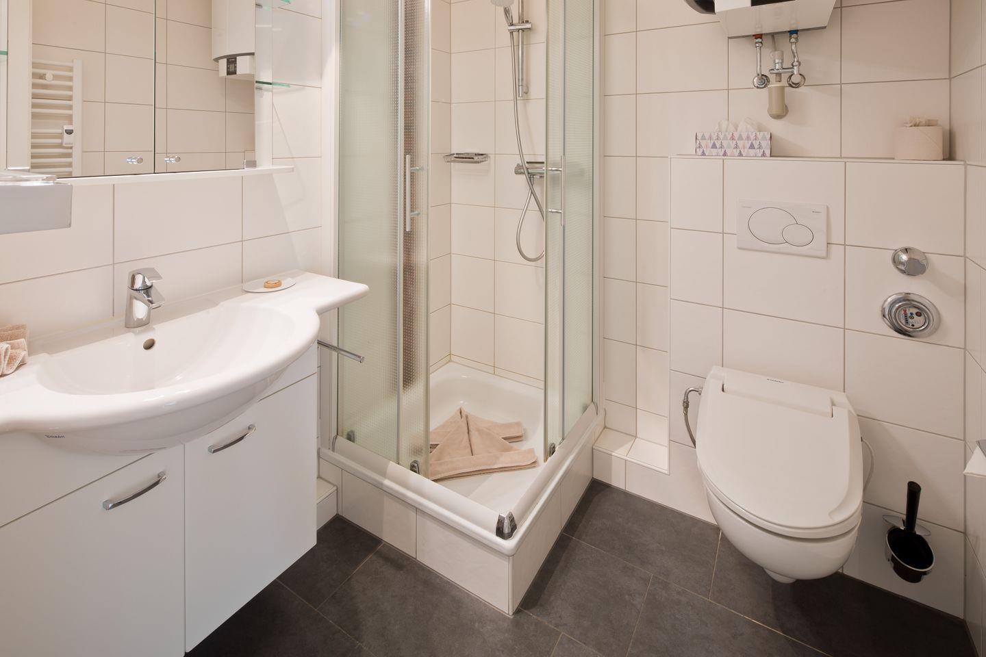 Helle Ferienwohnung mit Meerblick in 1. Reihe. Modernes Badezimmer mit Dusche und WC/Bidet.