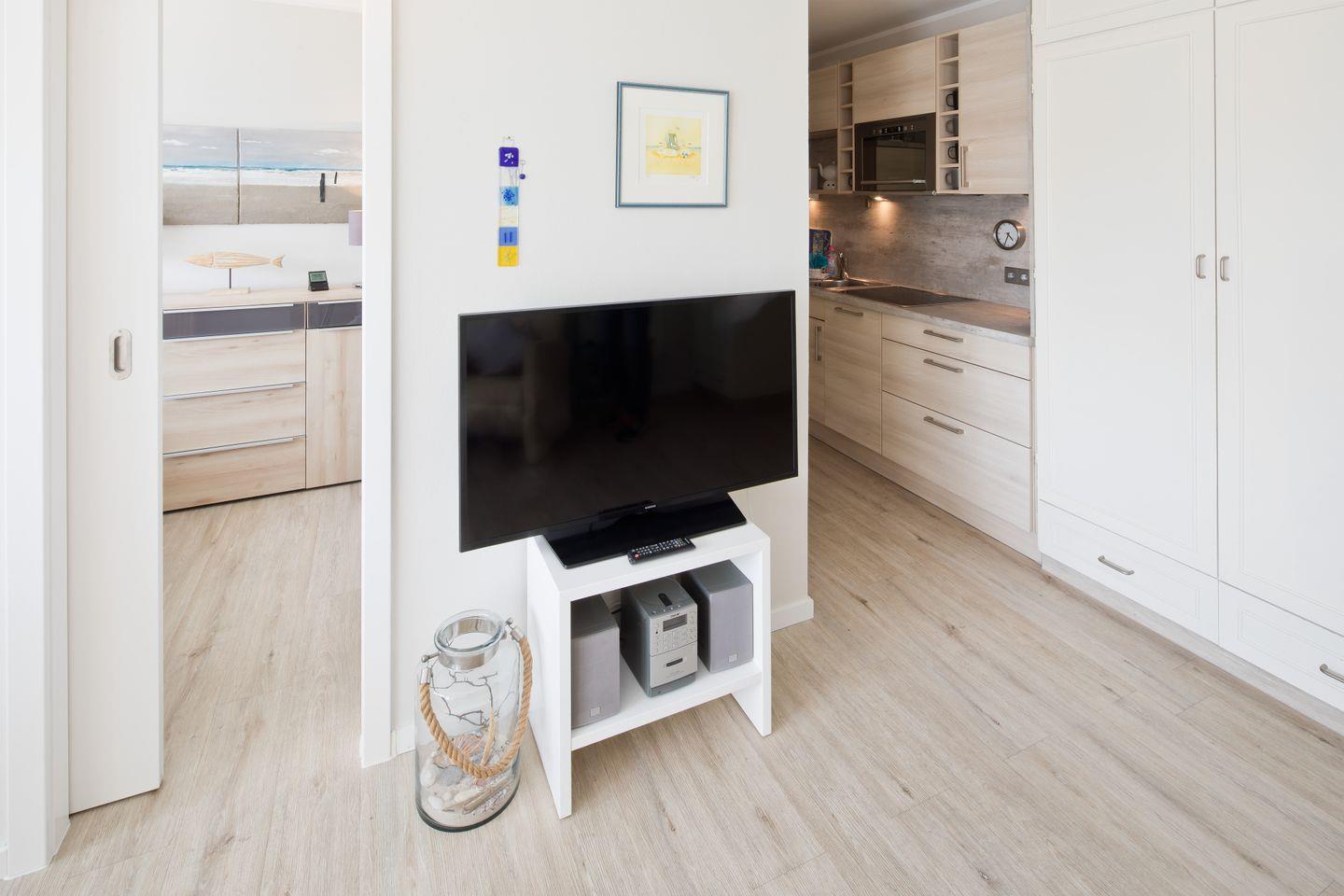 Schönen Küchenzeile mit Geschirrspülmaschine, Filterkaffeemaschine und Senseo-Pad-Maschine, helles freundliches Wohnzimmer mit zwei Sesseln und Schlafzimmer mit zwei Einzelbetten. Sonnenbalkon mit West-Ausrichtung und Meerblick. Die Wohnung liegt im 1. Stock wurde Ende 2018 renoviert und bietet in warmen Tönen ein gemütliches Ferienzuhause. Im Haus befindet sich ein Fahrstuhl.