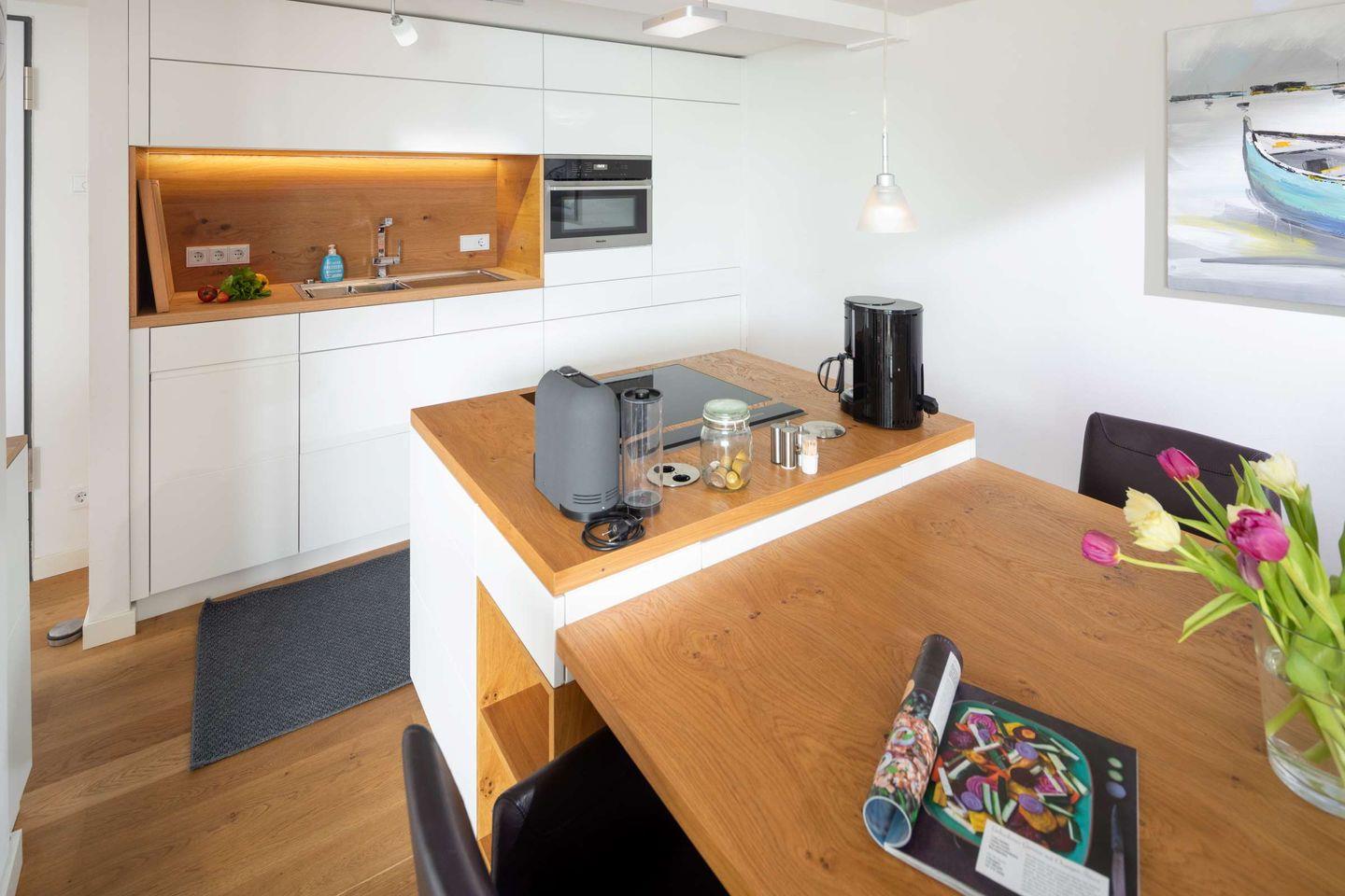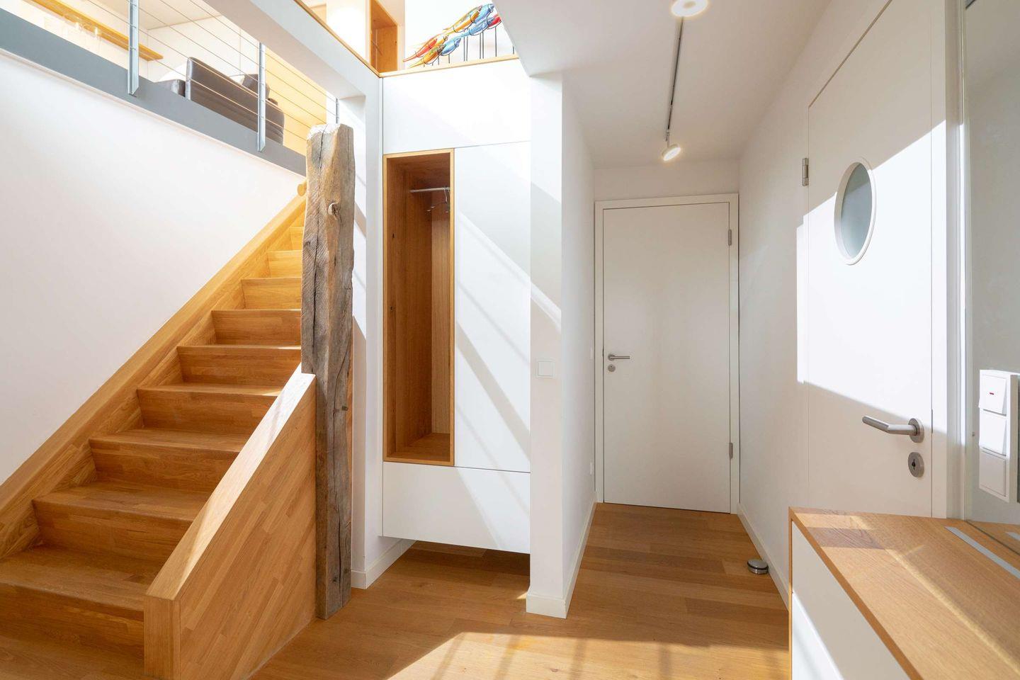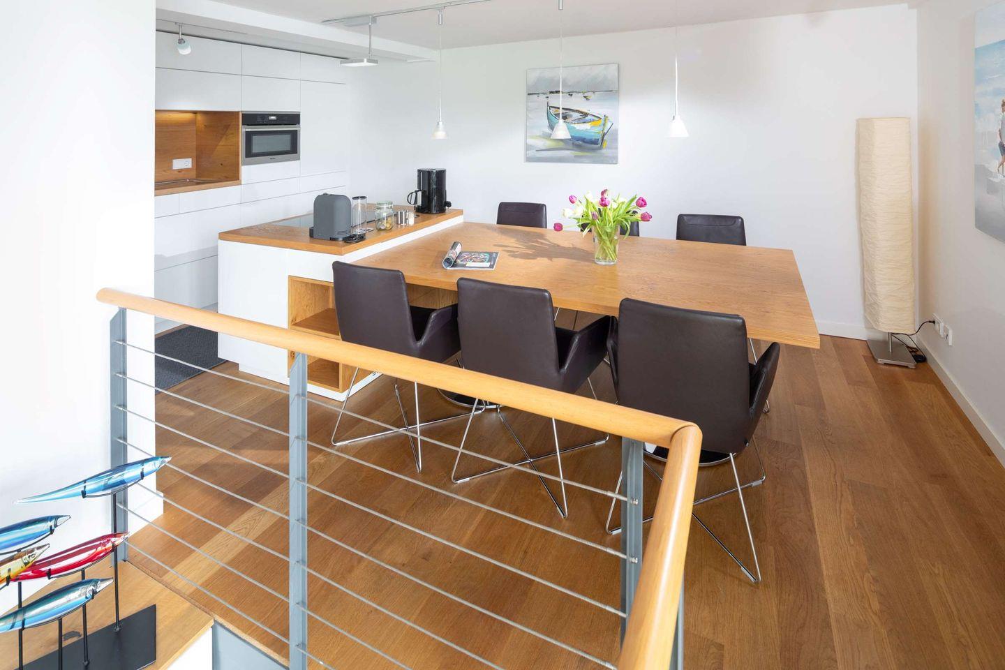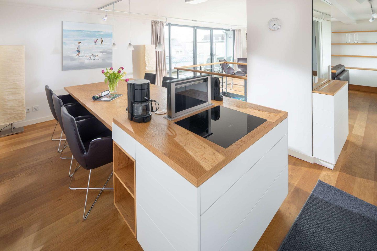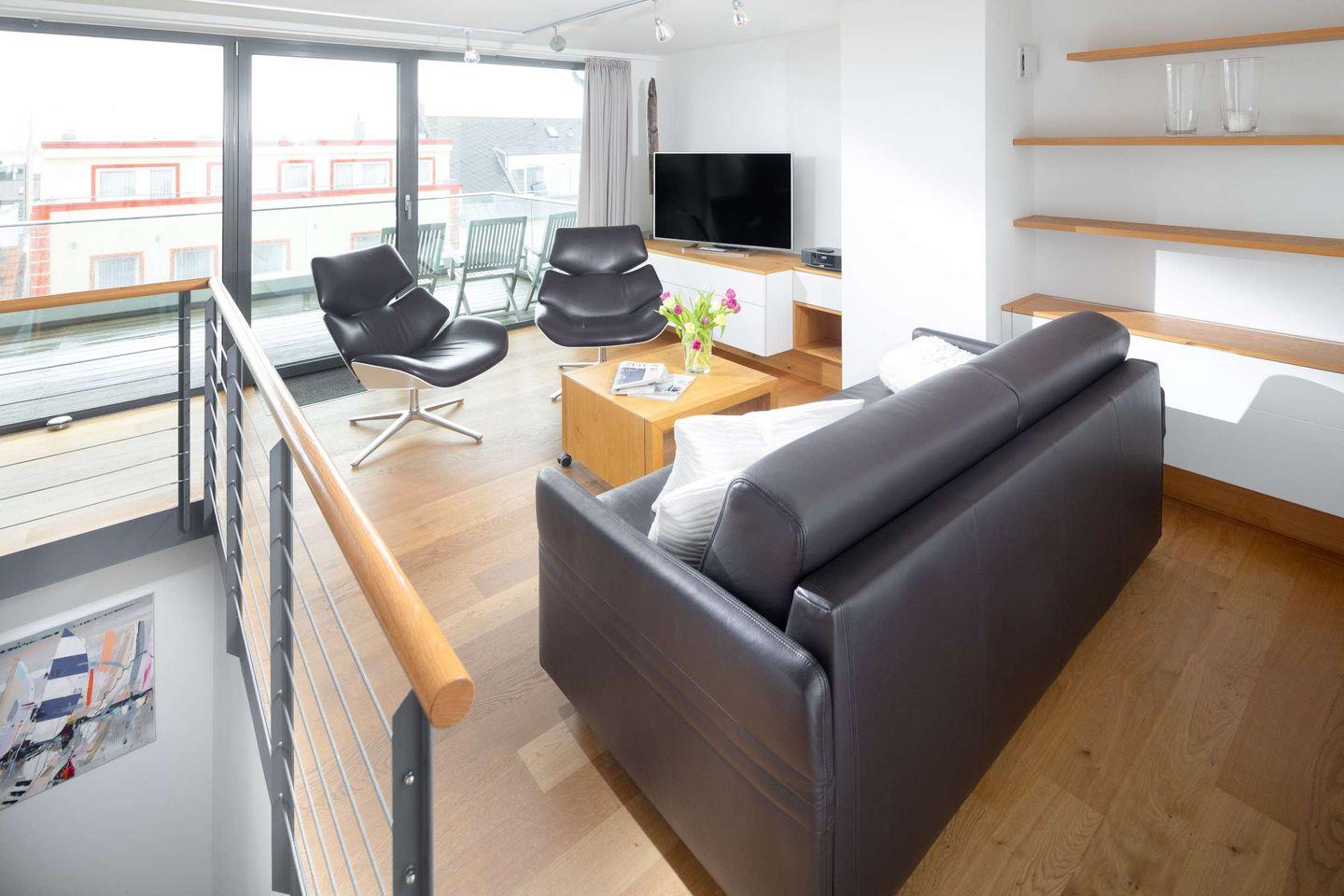 Die Wohnung erstreckt sich über zwei Etagen: In der oberen Etage (4) befinden sich der Wohnraum mit Küche, ein Schlafzimmer und der Zugang zum großzügigen Balkon mit Meerblick und einem weiten Blick über die Dächer der Innenstadt. Genießen Sie goldene Sonnenuntergänge und entspannen Sie auf Deck.