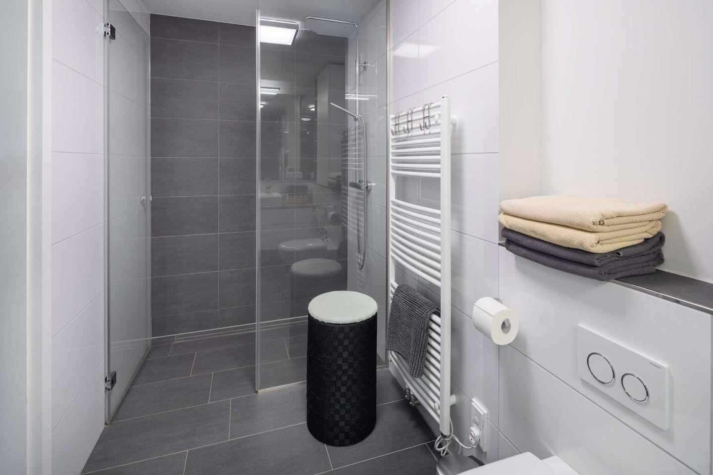 Die Wohnung ist bequem über einen Liftzugang direkt in den Wohnbereich erreichbar, was besonders komfortabel ist. Sie betreten die Wohnung durch einen großzügigen Garderobenbereich, der ausreichend Platz für Ihre persönlichen Dinge bietet. Insgesamt verfügt die Wohnung über zwei Schlafzimmer, beide ausgestattet mit einem eigenen TV für individuelle Unterhaltung.