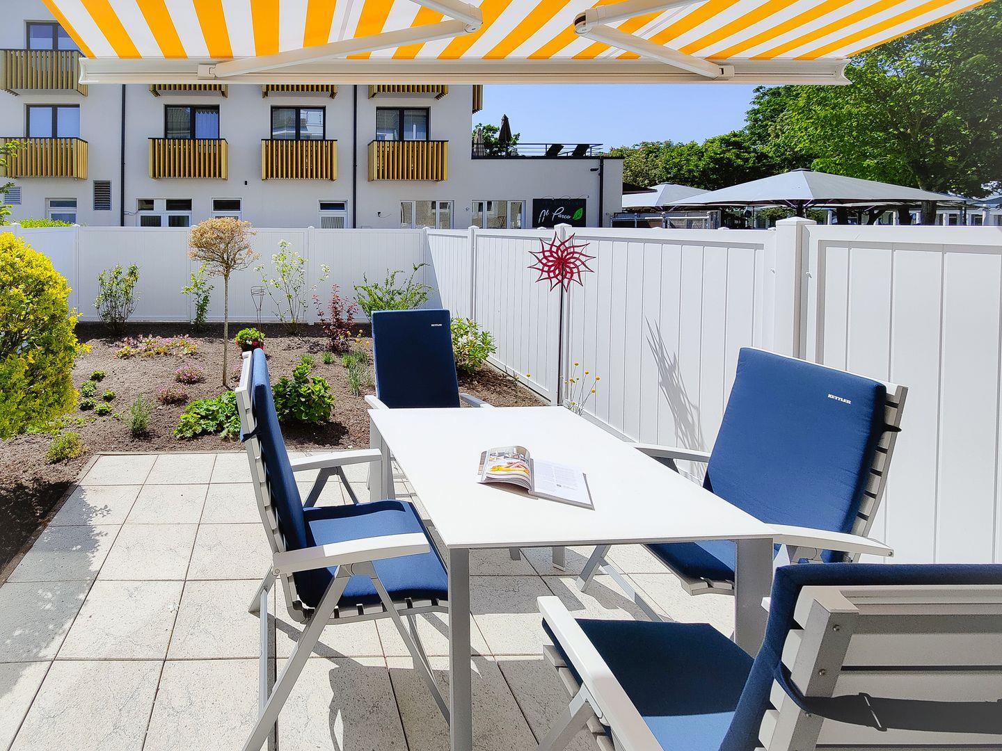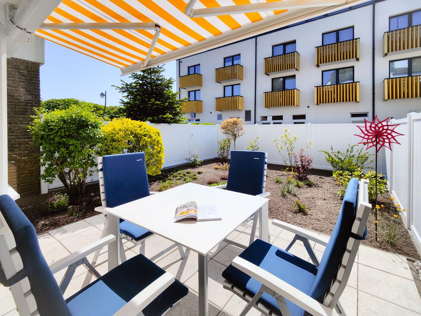 Auf der möblierten Terrasse können Sie Ihre Urlaubstage entspannt ausklingen lassen. Genießen Sie die frische Nordseeluft und lassen Sie die Seele baumeln. Die Südterrasse mit Gartenmöbeln und Sonnenschirm steht Ihnen während der Sommersaison zur Verfügung.
