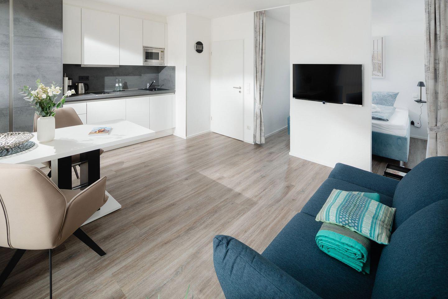 Für Unterhaltung sorgen ein LOEWE-Fernseher mit digitalem Radioempfang, USB-Anschluss und Internetfunktion. Ein kostenloser WLAN-Zugang steht Ihnen in der gesamten Wohnung zur Verfügung.