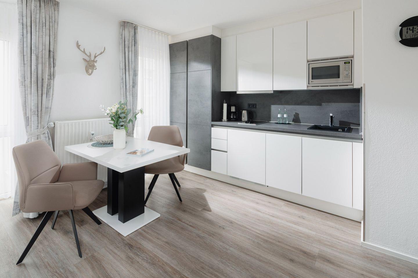 Das Luisenstudio wurde von Grund auf in 2021 renoviert. Es erwartet Sie eine ca. 33 qm große Wohnung, für bis zu 2 Personen. Die Ferienwohnung bietet Ihnen eine Komposition aus natürlichen, farblich abgestimmten Materialien, die Ihnen Gemütlichkeit und Wohnkomfort garantieren. Sehr bequeme, drehbare Sitzstühle, eine moderne Küchenzeile mit umfangreicher Ausstattung und zwei Sessel komplettieren den Raum. Zum separaten Schlafbereich gehören ein Boxspringbett und Wandbeleuchtungen, in die jeweils ein USB-Anschluß für Ihr Smartphone integriert ist. Das Bad glänzt mit italienischen Designerstücken und außergewöhnlicher Farbgestaltung.
