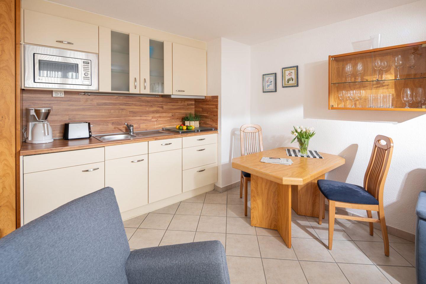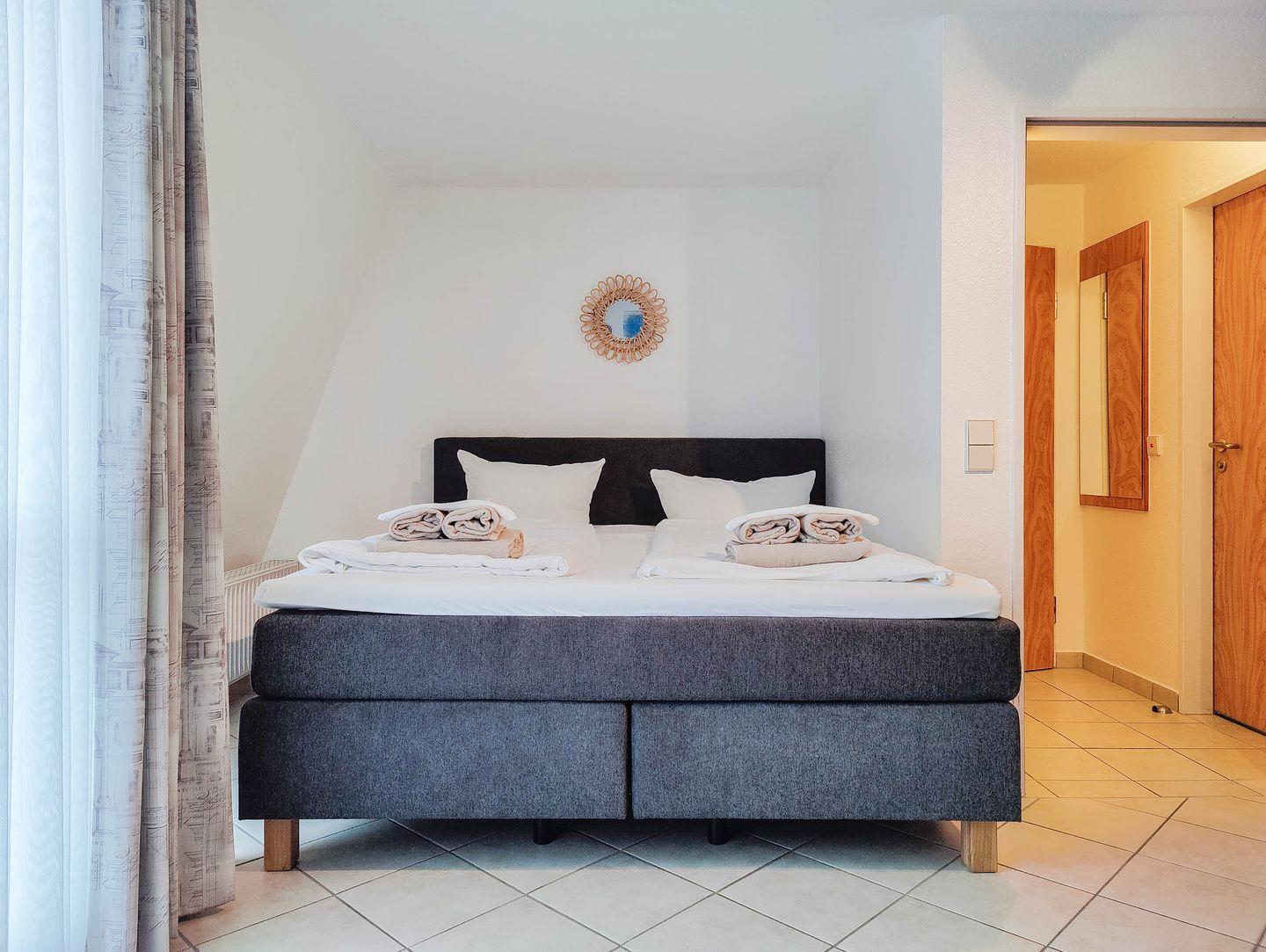 Die Wohnung zeichnet sich durch einen offenen Wohn-/Schlafraum aus, der neben einer gemütlichen Sitzecke und einer Einbauküche auch ein neues Boxspringbett umfasst. Diese moderne Ausstattung sorgt für Komfort und Gemütlichkeit während Ihres Aufenthalts. Vom Flur aus gelangen Sie in das neue Badezimmer, das mit einer Dusche mit flachem Einstieg, einem Waschbecken inklusive Unterschrank, WC und einem Handtuchheizkörper ausgestattet ist.