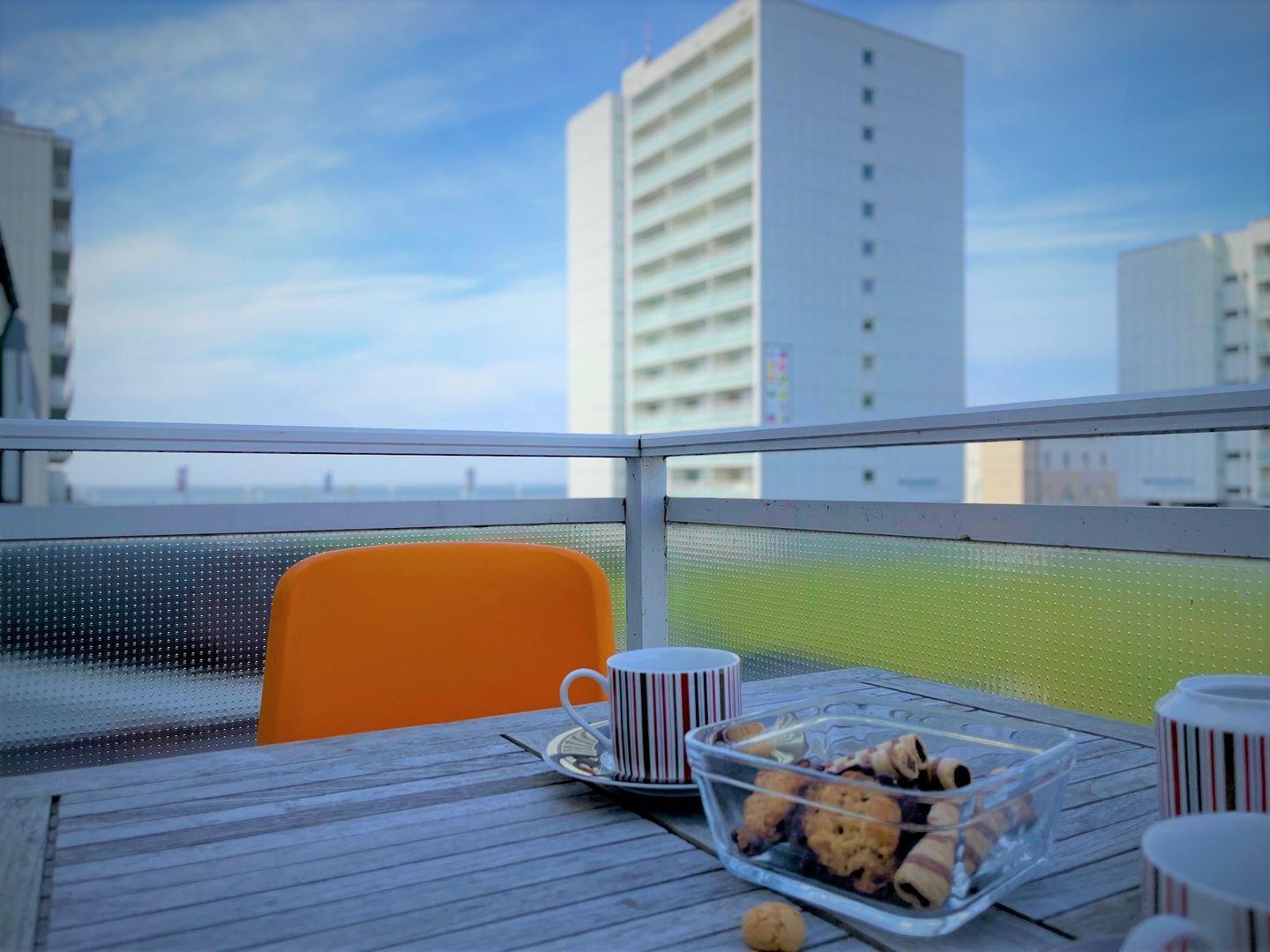 Angrenzend befindet sich ein schöner Balkon mit seitlichem Meerblick.