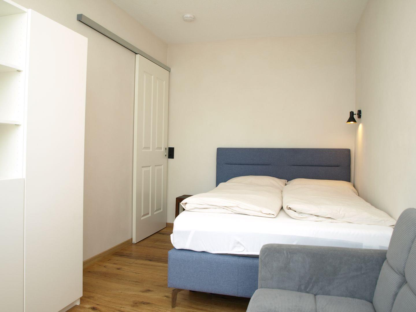 Das zweite Doppelzimmer ist mit einem Doppelbett (1,40 x 2,00m), einem Sofa welches auf Anfrage als Schlafsofa genutzt werden kann sowie einem Regal ausgestattet.