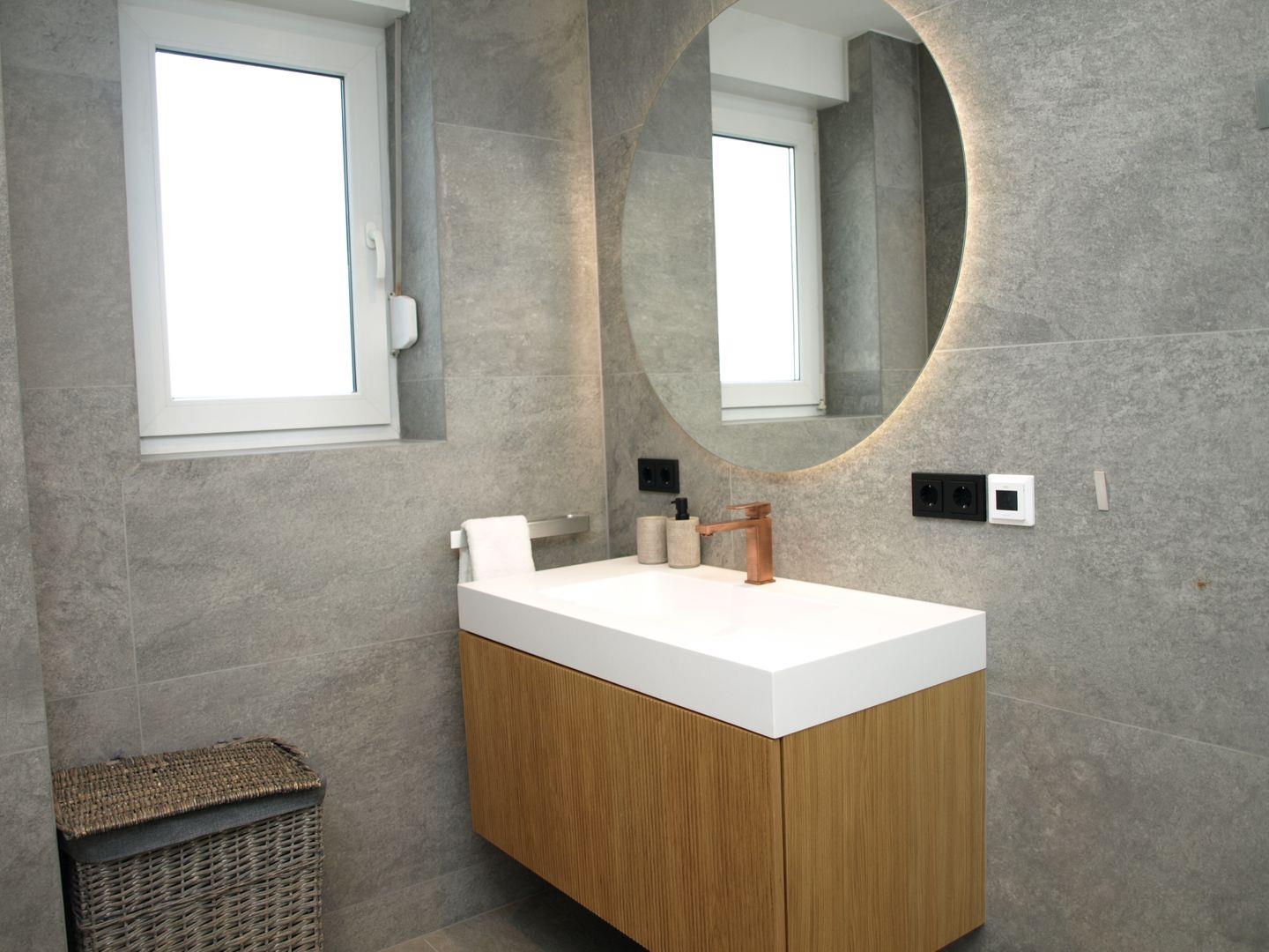 Das in Steinoptik gehaltene Badezimmer hat eine Dusche und Toilette sowie einen Waschtischunterschrank, Fußbodenheizung und Handtuchheizkörper.