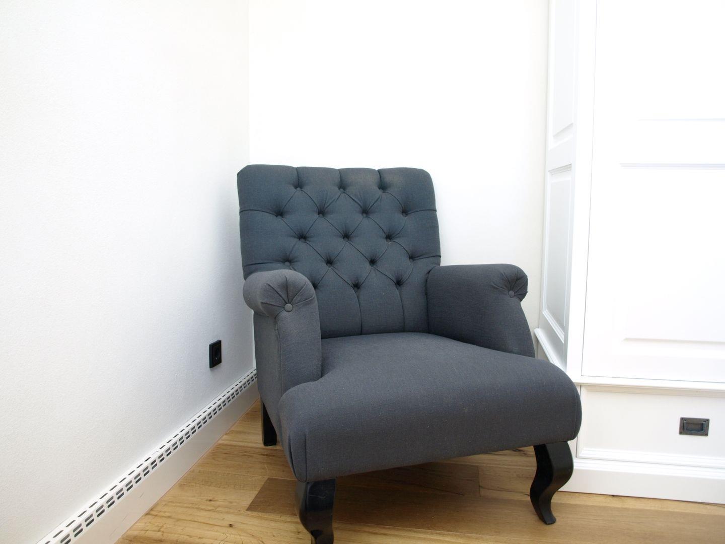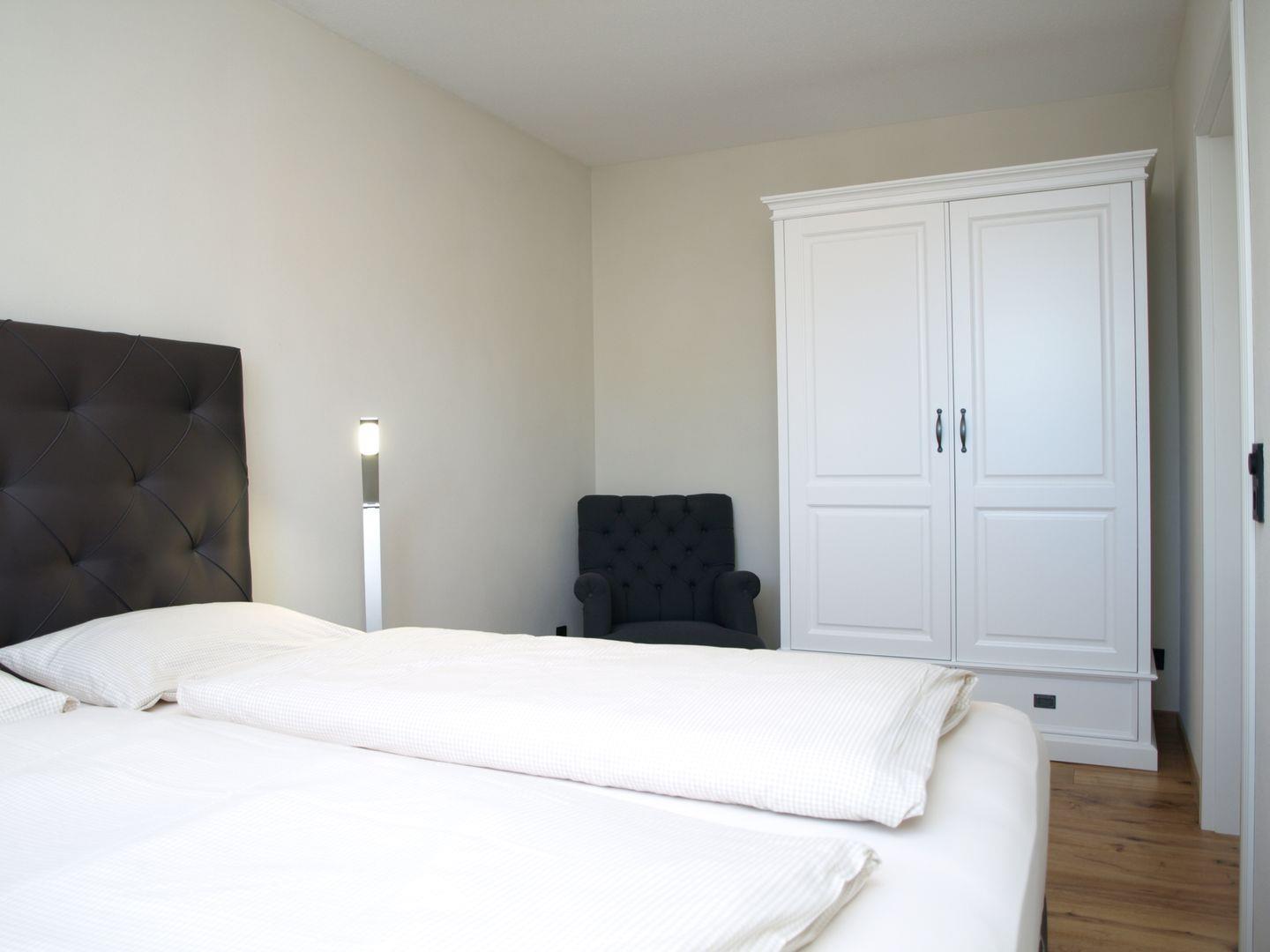 Ein Schlafzimmer ist mit einem Doppelbett (1,80 x 2,00m), einem weißen Schrank und einem Relaxsessel ausgestattet.