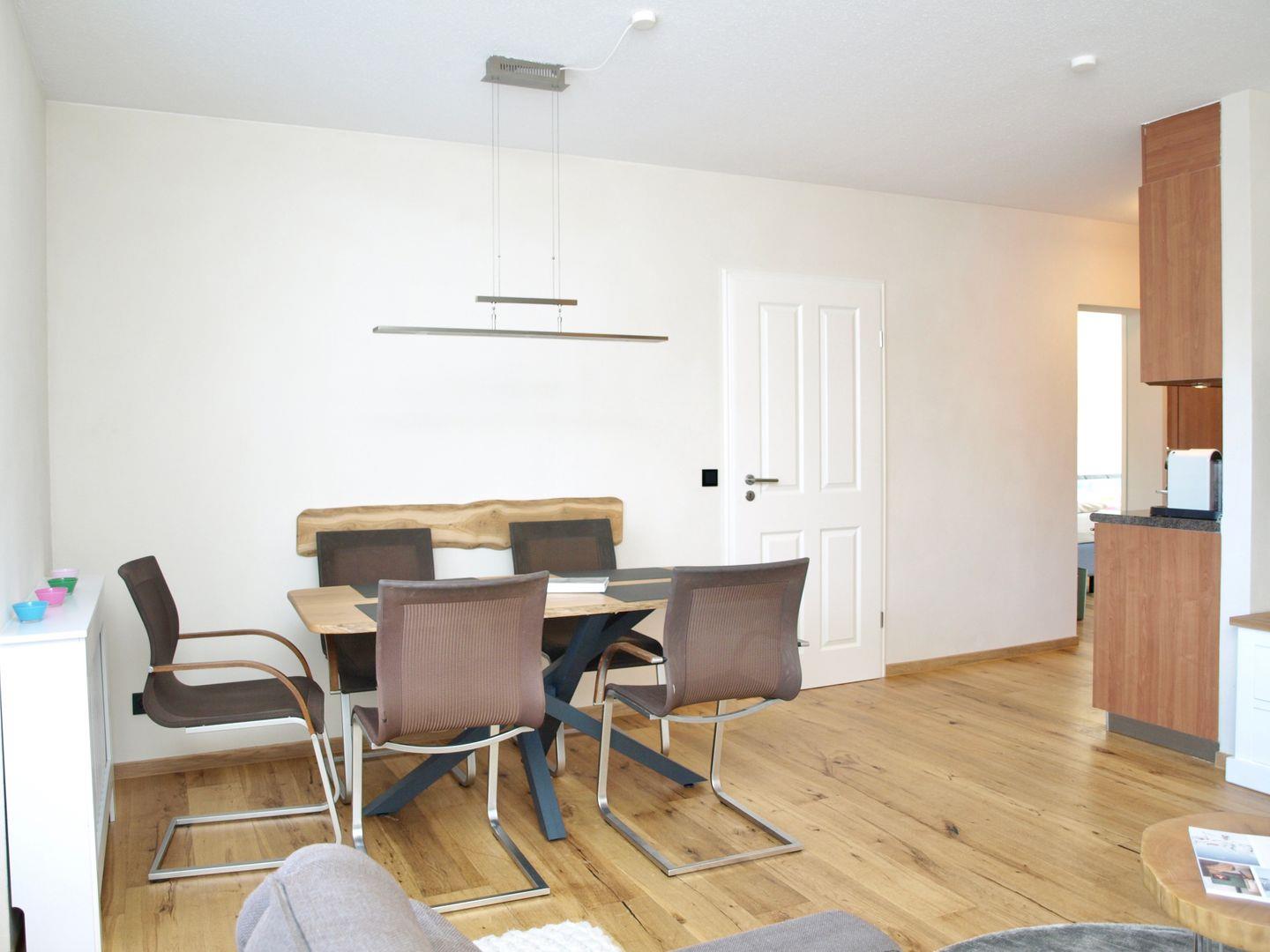 Der handgemachte Eichenholzesstisch lädt zum ausgiebigen Frühstück oder langen Spieleabenden ein.