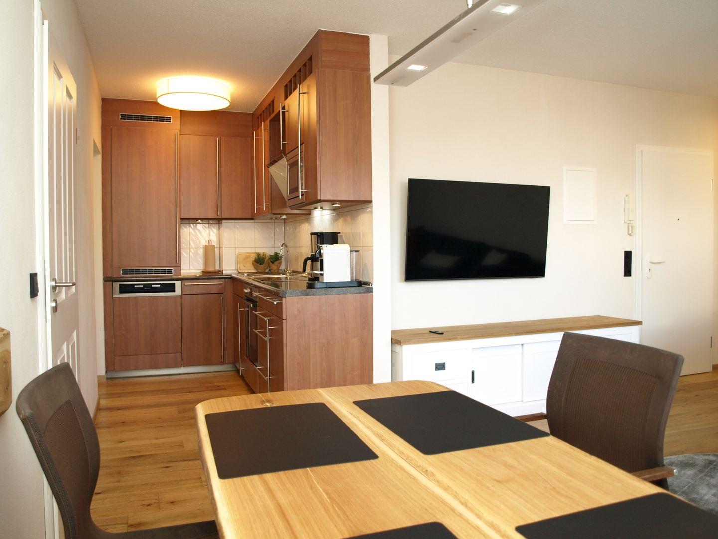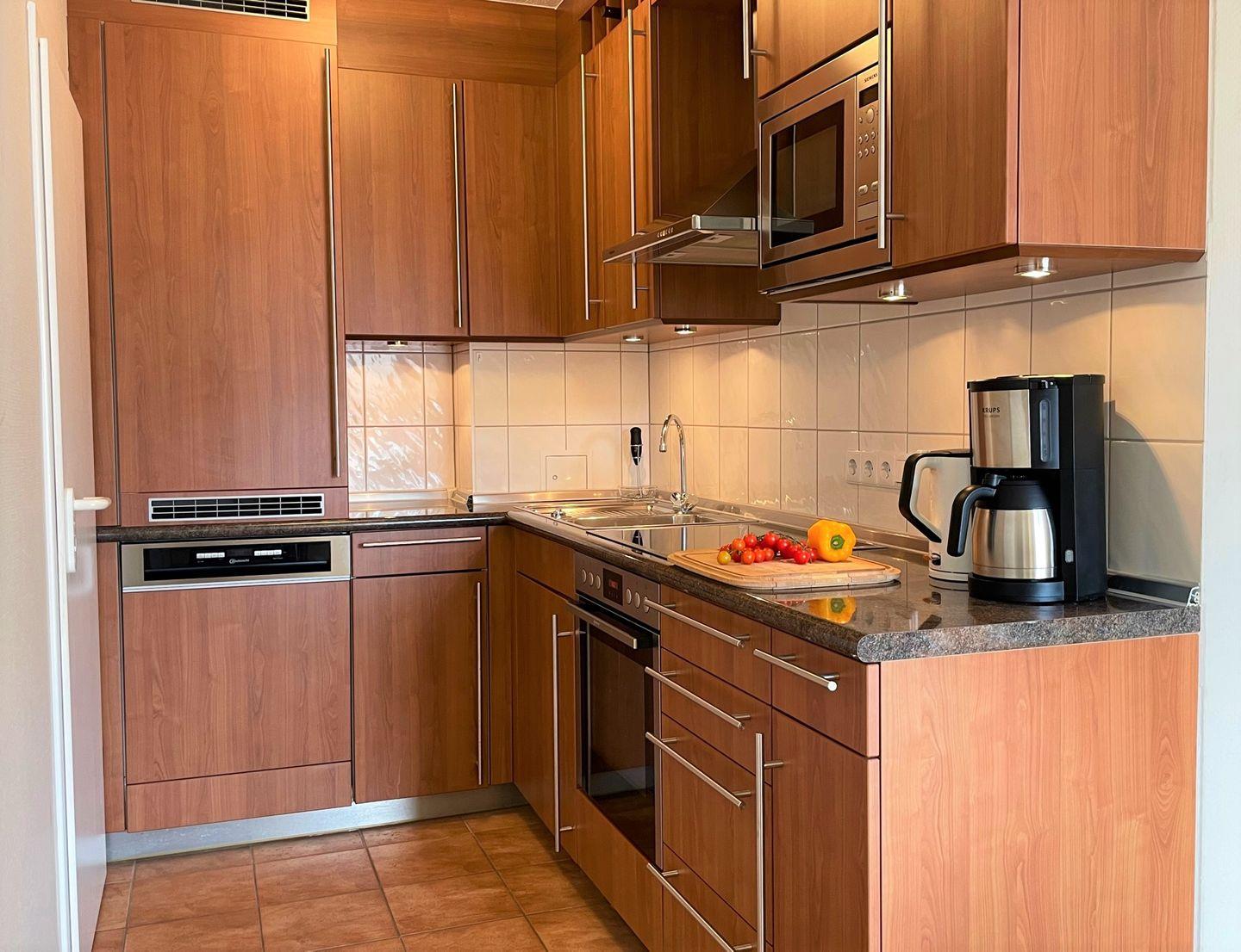 Die hochwertige Küchenecke ist komplett mit Backofen, Mikrowelle, Geschirrspüler, Kaffeemaschine, Toaster und Wasserkocher ausgestattet.