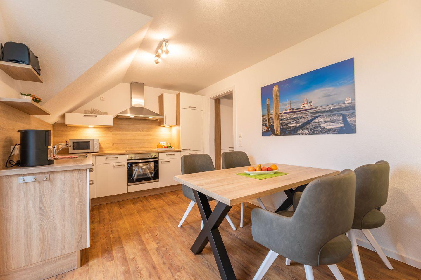 Die komfortable und sehr geschmackvoll eingerichtete Ferienwohnung auf ca. 80 qm und drei Räumen überzeugt durch ihre ruhige Lage. Der helle und freundliche Wohnbereich mit bodentiefen Fenstern verfügt über einen geräumigen Essplatz für 4-6 Personen.