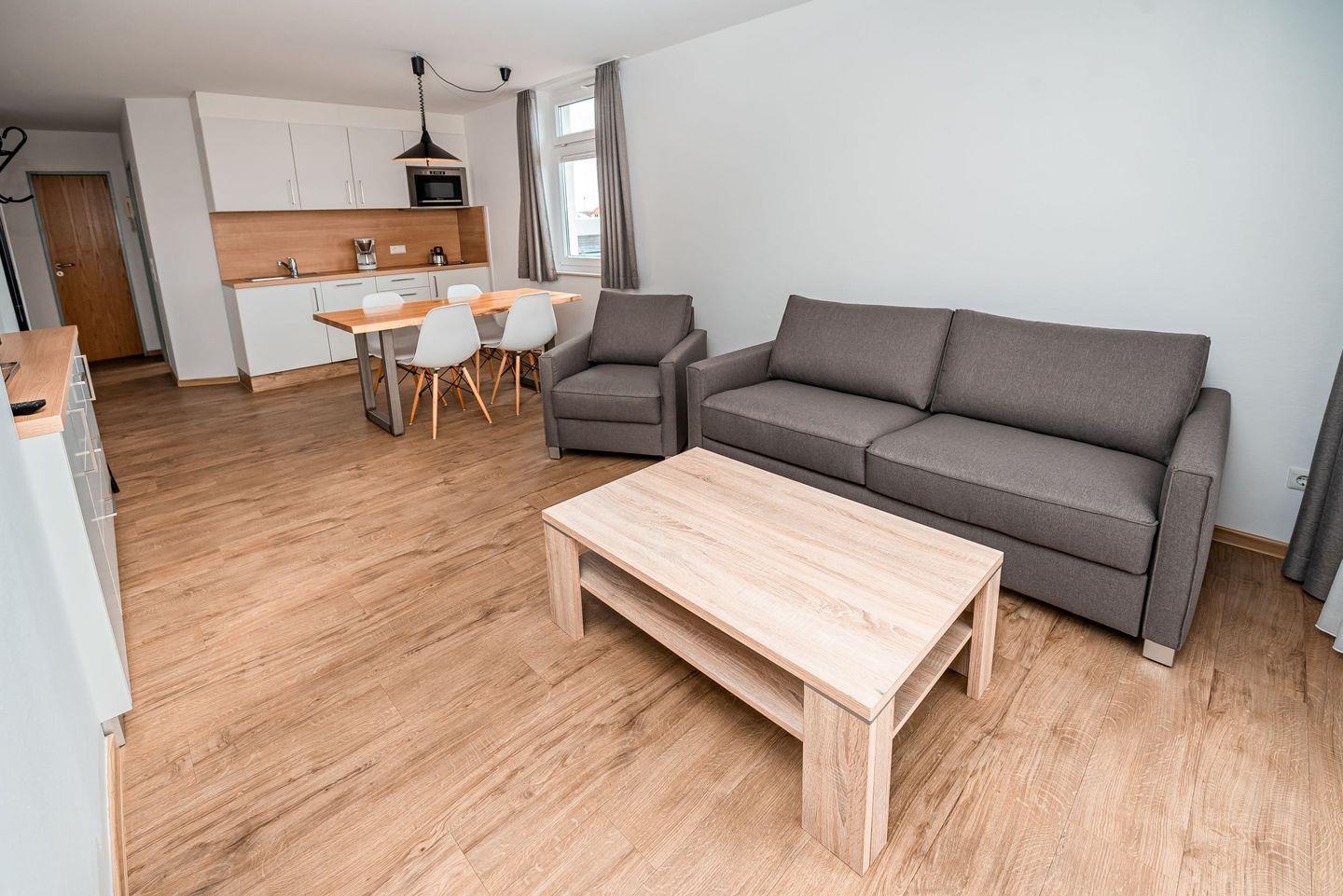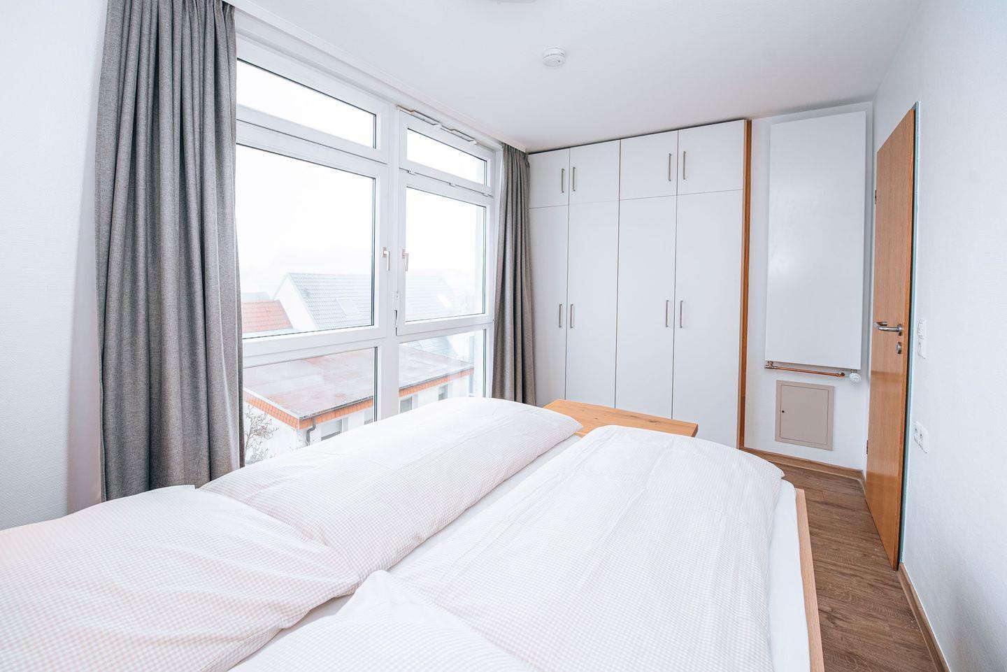 Im Wohnbereich steht eine gemütliche Couch mit Schlaffunktion und ein Fernsehgerät. Die hellen Möbel geben dem Raum seinen Gemütlichkeit. Des Weiteren gibt es einen separaten Essplatz, der für 4 Personen ausreichend Platz bietet. Der Eingangsbereich sowie ein Abstellraum vervollständigen diese Ferienwohnung. Der vom Wohnzimmer aus zu begehende Balkon ist nach Süden ausgerichtet. Das separate Schlafzimmer ist durch die bodentiefen Fenster hell und freundlich und mit einen Doppelbett sowie geräumigen Kleiderschrank ausgestattet.