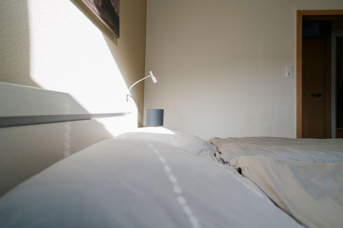 Zum Schlafen gibt es ein großzügiges Elternschlafzimmer und ein Kinderzimmer mit Etagenbett. Ein besonderer Pluspunkt ist die große Dusche im Bad. Die Wohnung bietet mit der warmen Farbgestaltung ein sehr behagliches Wohngefühl.