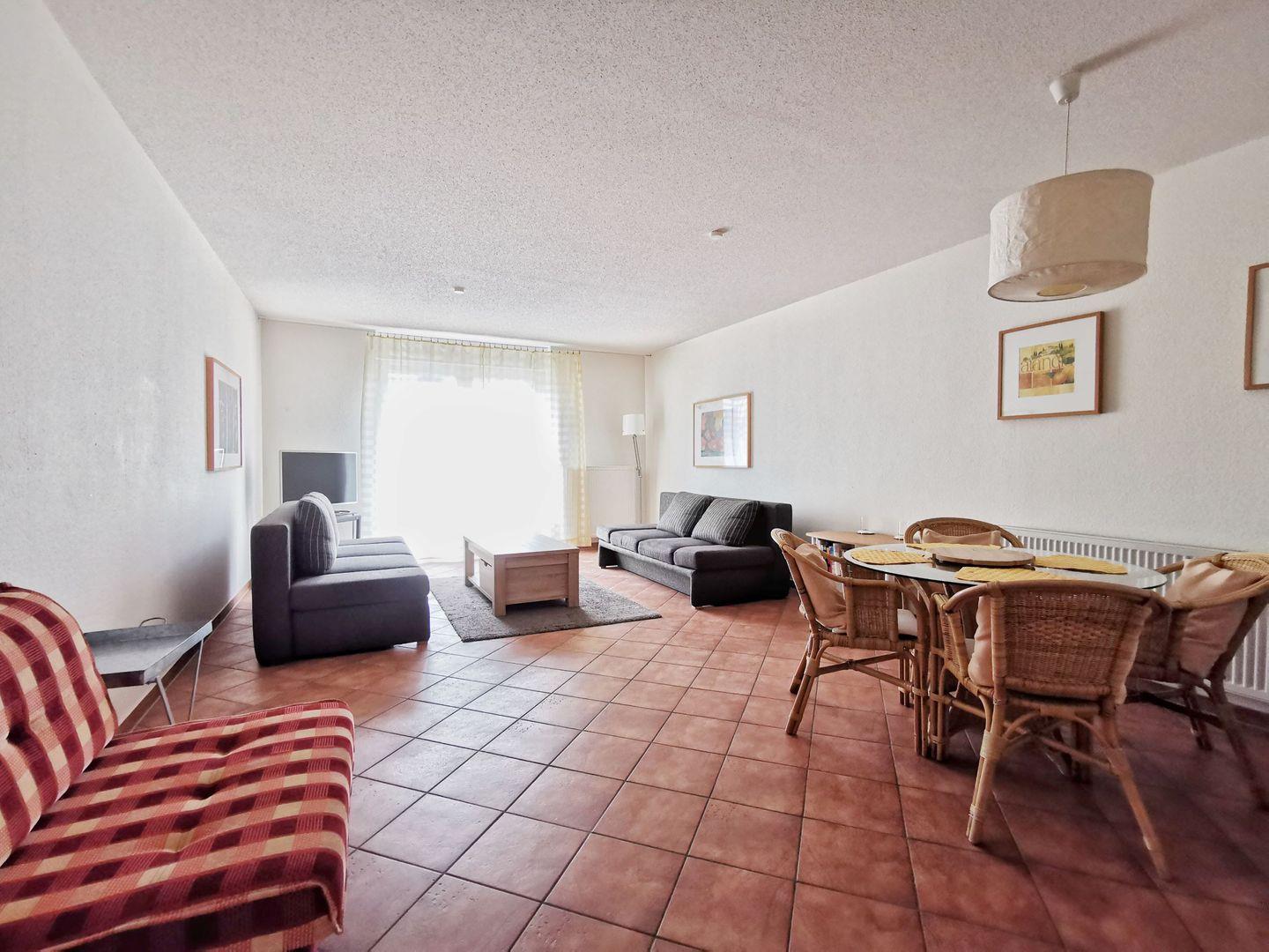 Die ca. 55 m² große Zweiraumwohnung im 1. Obergeschoss bietet modernen Komfort und eine freundliche Atmosphäre. Der großzügig geschnittene Wohnraum ist mit zwei bequemen Sofas ausgestattet, auf denen man es sich am Abend oder bei schlechtem Wetter mit einem guten Buch gemütlich machen kann. Für Unterhaltung sorgen ein Flachbild-Kabel-TV sowie eine kleine Stereoanlage. Zusätzlich bietet ein Schlafsessel eine weitere Schlafmöglichkeit für eine dritte Person.