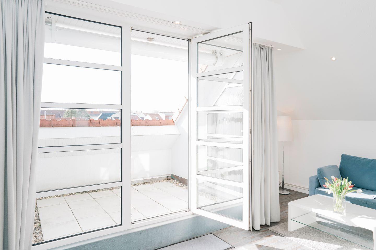 Ein gemütlicher Essplatz unter einer Schräge, ein Abstellraum sowie ein Flur ergänzen diese Ferienwohnung. Der Balkon hat Südlage und ist mit Tisch, Stühlen und einer Markise ausgestattet.