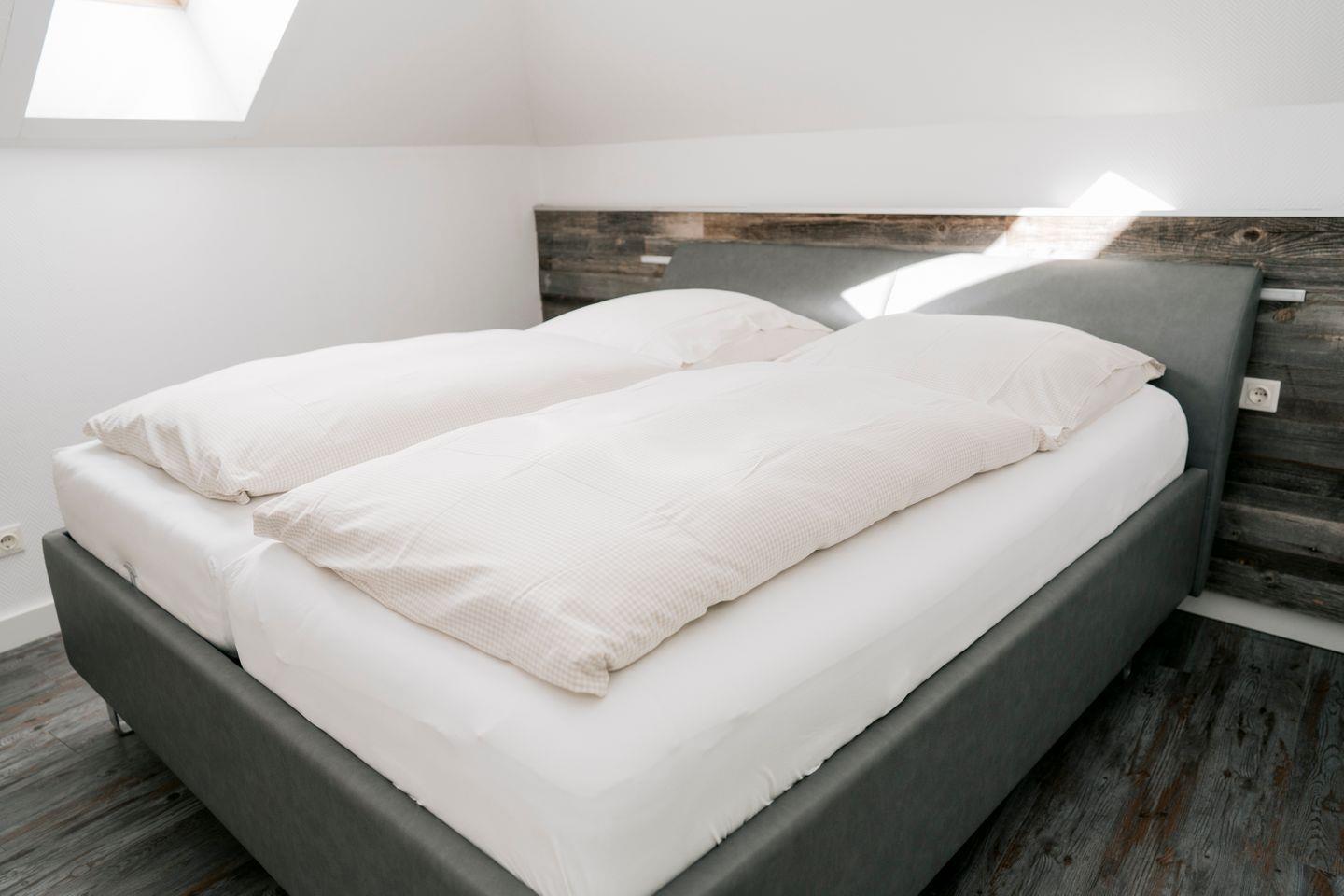 Die Schlafplätze liegen im separaten Schlafzimmer (Doppelbett) und im Wohnraum (ausziehbare Couch mit Lattenrost).