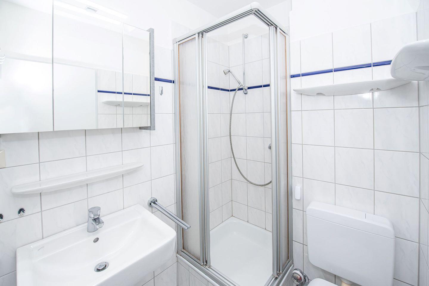 Das freundliche Badezimmer verfügt über Dusche und WC.