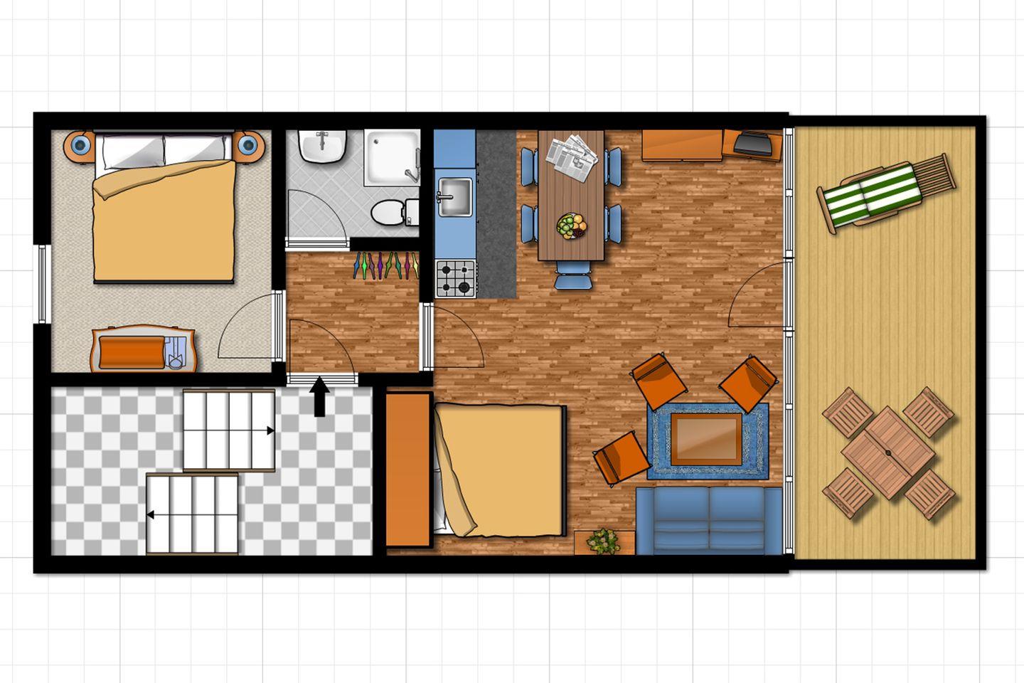 Der gemütliche Wohnraum lädt mit einem bequemen Sofa und zwei Sesseln zum Entspannen ein. Die große Fensterfront sorgt für viel Tageslicht und schafft eine freundliche, helle Atmosphäre. Für zusätzliche Schlafmöglichkeiten sorgt ein praktisches Schrankbett im Wohnraum.