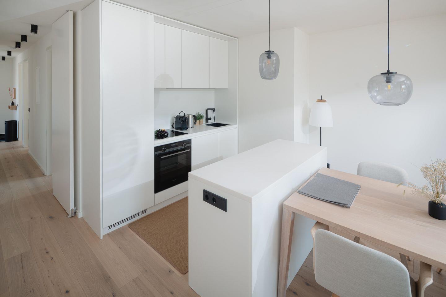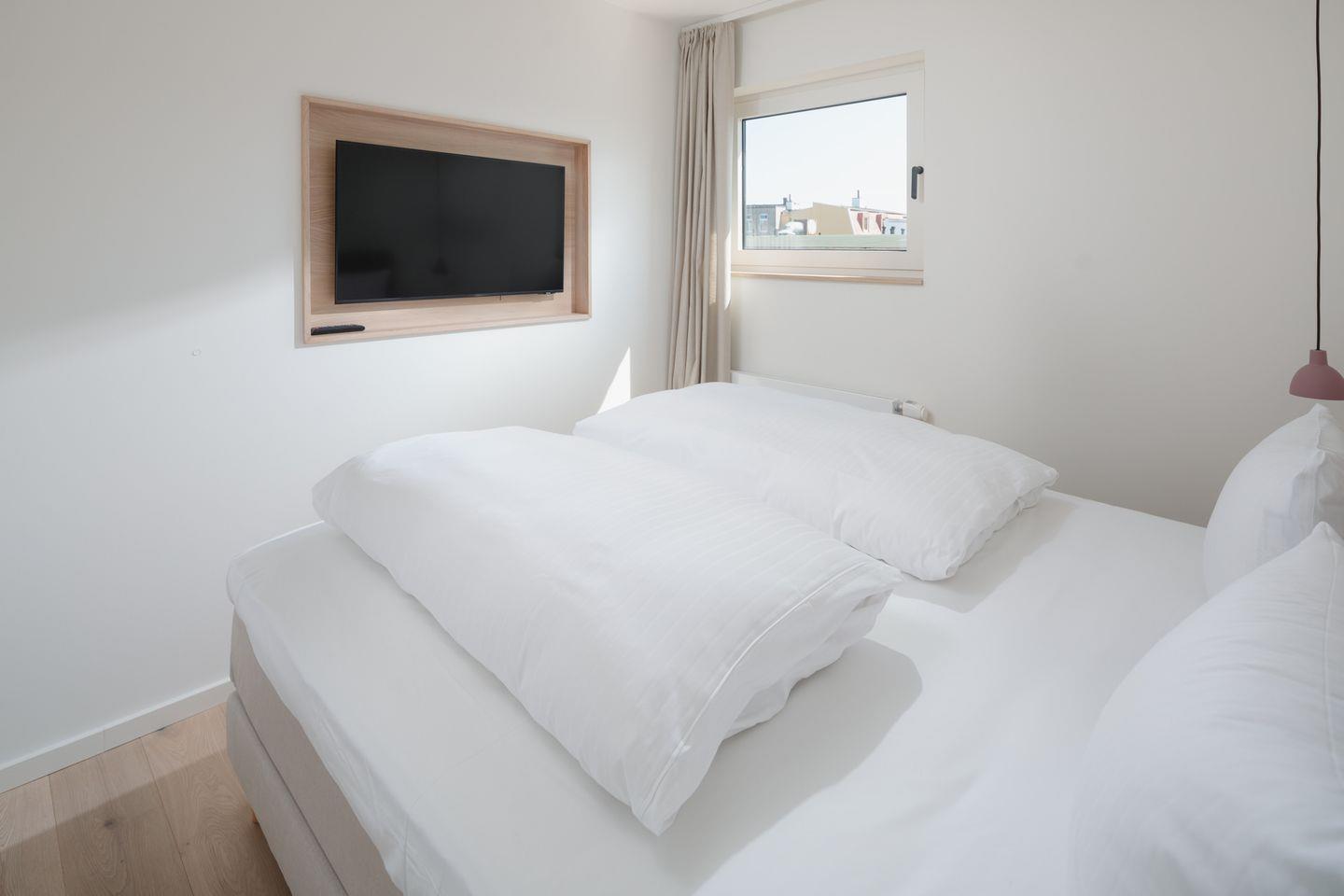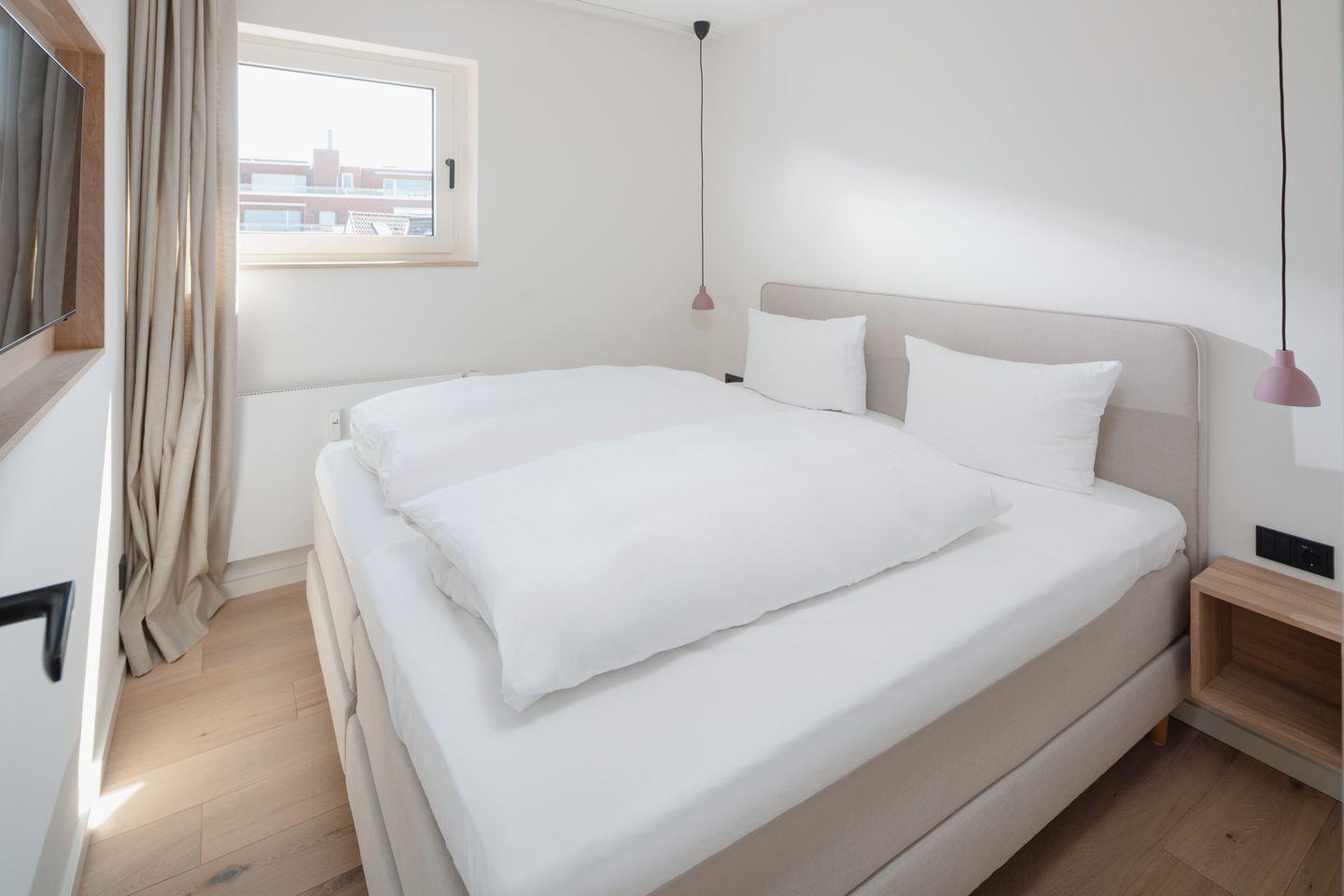 Es gibt insgesamt 2 Schlafzimmer mit 3 Betten (1 Doppelbett, 1 Einzelbett), ideal für Familien oder kleine Gruppen. Die Wohnung wurde mit Echtholzparkett ausgestattet. Beim Design der Wohnung wurde auf helle und natürliche Farben Wert gelegt. Das moderne Badezimmer verfügt über ein Außenfenster, was für eine gute Belüftungsmöglichkeit sorgt, und die Dusche wurde mit einer Regendusche ausgestattet. Die offene und moderne Wohnküche wurde mit einem Essbereich eingerichtet. Die Ferienwohnung verfügt über einen Südbalkon. Waschmaschine und Wäschetrockner befinden sich im Haus und stehen (für die gemeinschaftliche Nutzung gegen Gebühr) zur Verfügung, was besonders für längere Aufenthalte von Vorteil ist. Haustiere sind nicht erlaubt.