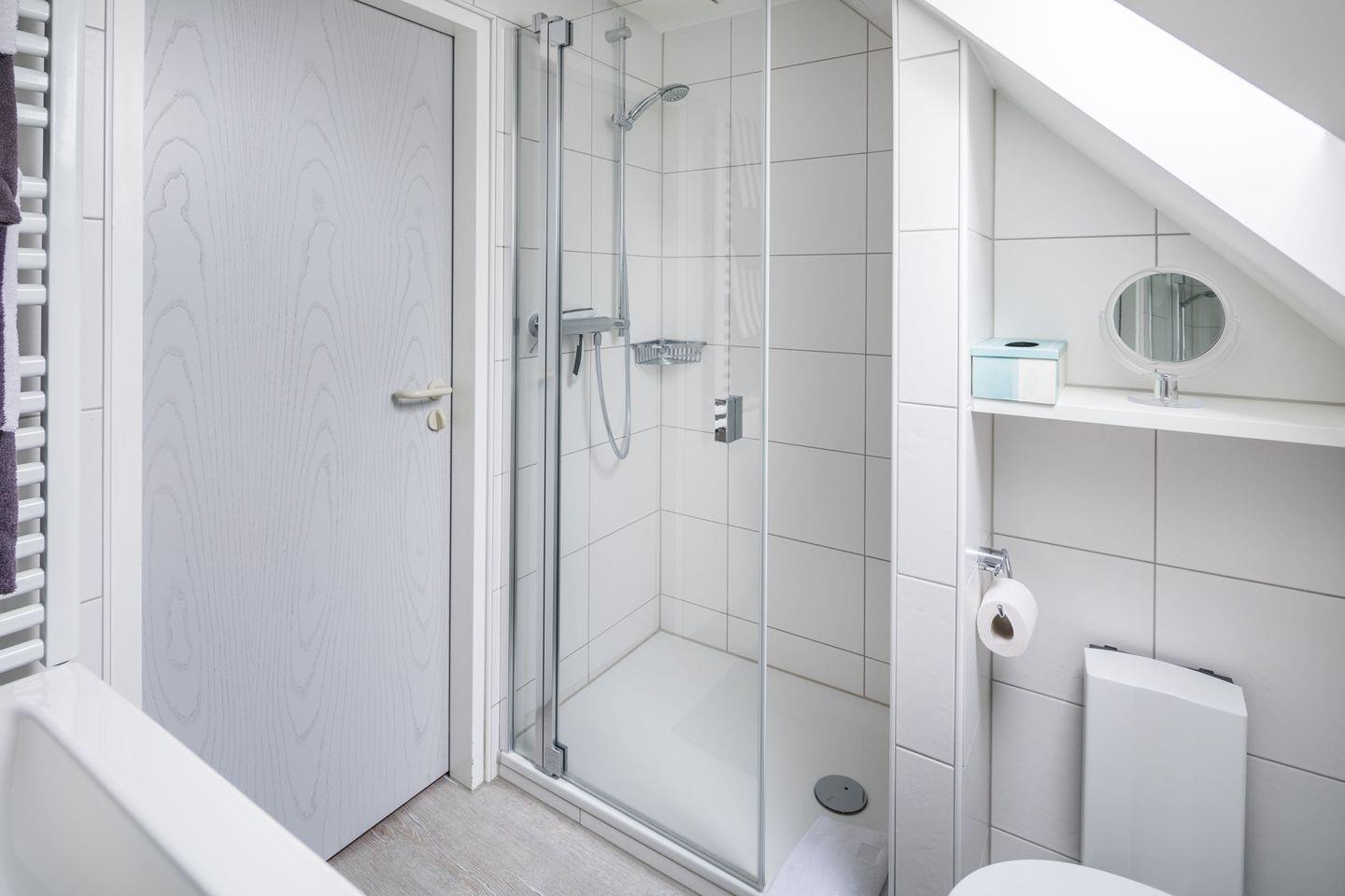 Das Badezimmer überzeugt mit einem modernen Design und ist mit einer Dusche, einem Kosmetikspiegel und einem Haartrockner ausgestattet. Erleben Sie nach einem Tag am Strand entspannende Momente bei einer warmen Dusche und nutzen Sie die bereitgestellten Handtücher und die Erst-Ausstattung, um Ihren Aufenthalt so angenehm wie möglich zu gestalten.