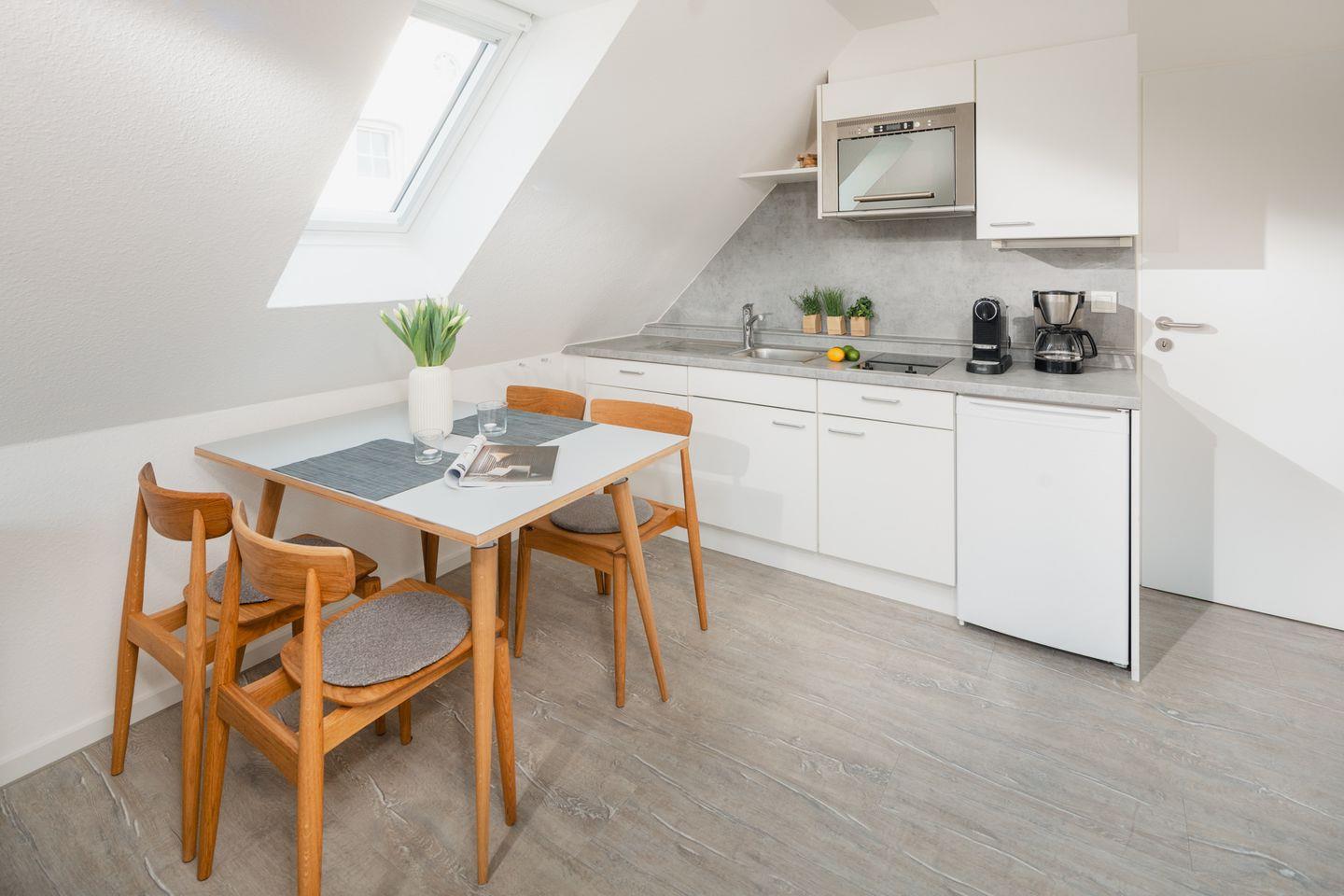 Die moderne Küche lädt dazu ein, kulinarische Köstlichkeiten zuzubereiten. Ausgestattet mit hochwertigen Geräten, darunter ein Ceranherd, Kühlschrank mit Gefrierfach, Mikrowelle, Espressomaschine und allen notwendigen Küchenutensilien, haben Sie alles zur Hand, um ein schmackhaftes Frühstück oder ein vollwertiges Abendessen zu zaubern.