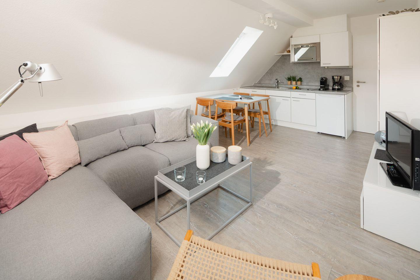 Die Wohnung verfügt über zwei gemütliche Schlafzimmer mit einem Doppelbett (160x200cm), die mit warmen Farben und modernem Vinylboden ausgestattet sind, um eine entspannte und einladende Umgebung zu schaffen. Das offene Wohnkonzept mit einem großzügigen Wohnzimmer ist der perfekte Ort, um gemeinsam zu entspannen. Hier finden Sie eine bequeme Sofaecke und einen Esstisch, an dem Sie Ihre gemeinsamen Mahlzeiten genießen können. Die technische Ausstattung lässt keine Wünsche offen: Ein TV mit Kabelanschluss sorgt für Unterhaltung an gemütlichen Abenden, während WLAN Ihnen ermöglicht, jederzeit mit der Welt verbunden zu bleiben.