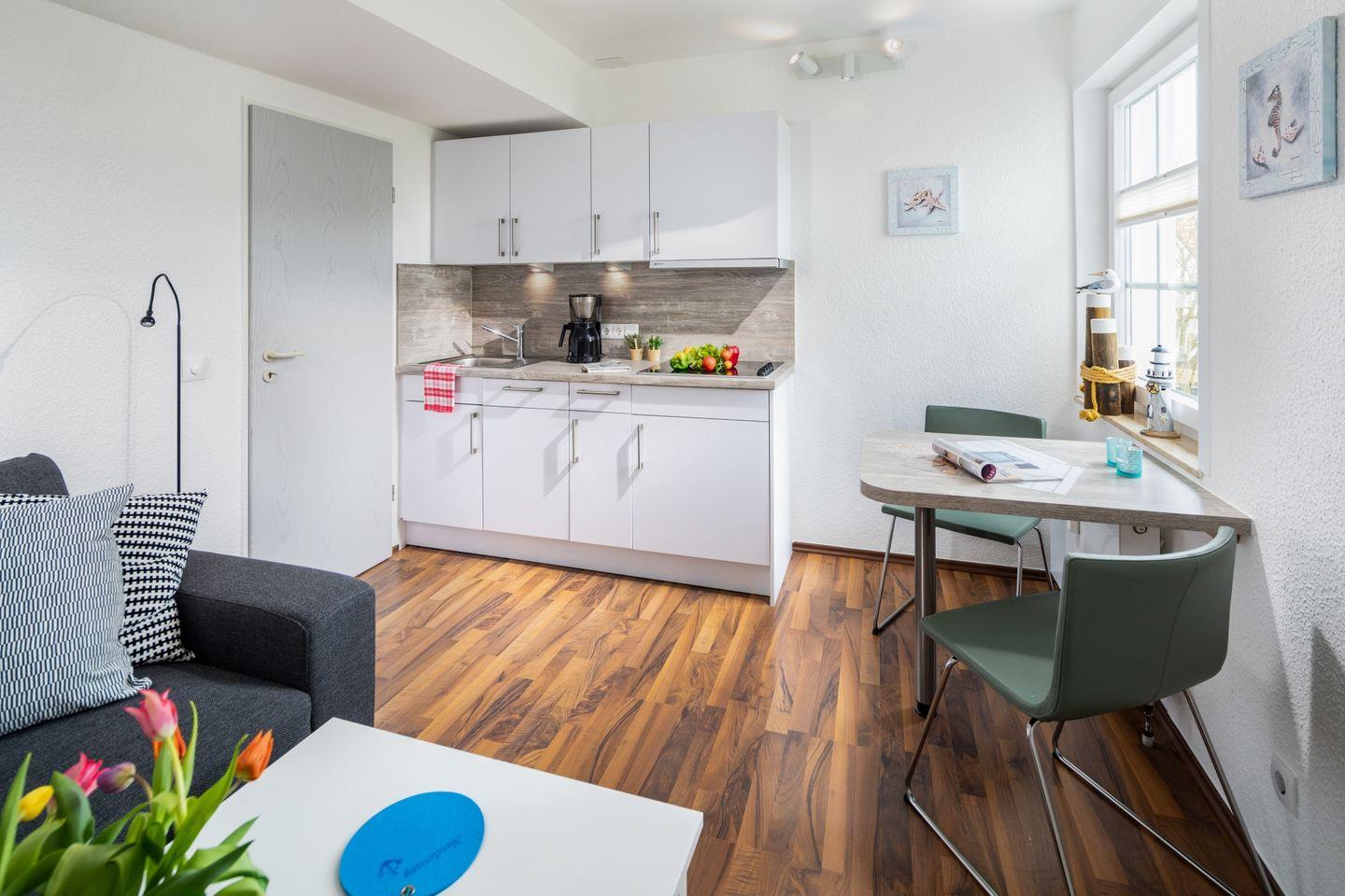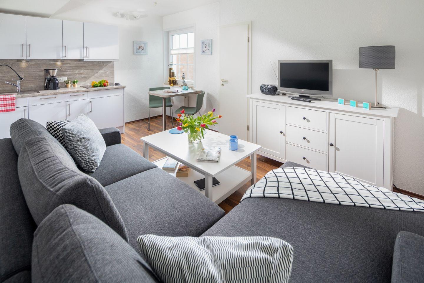 Die Wohnung ist hell und freundlich eingerichtet, mit einem Vinylboden, der Gemütlichkeit ausstrahlt. Nach einem erlebnisreichen Tag an der frischen Luft können Sie sich im Wohnbereich entspannen, der mit einer Sofaecke und einem TV ausgestattet ist. Von hier aus haben Sie auch Zugang zu einem gepflegten Balkon mit Gartenmöbeln, der zum Verweilen und Genießen der frischen Luft einlädt.