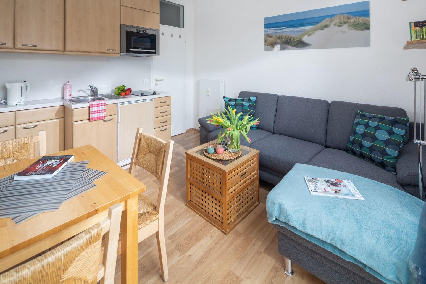 Das Herzstück der Wohnung ist der offene Wohnbereich, der durch große Fenster viel Tageslicht erhält und eine freundliche Atmosphäre schafft. Hier finden Sie ein gemütliches Sofa sowie einen Essbereich, der zum gemeinsamen Essen und geselligen Abenden einlädt. Die moderne Küche ist voll ausgestattet mit allem, was Sie für Ihre Selbstversorgung benötigen: von der Kaffeemaschine über die Mikrowelle bis hin zu Kühlschrank und Gefrierfach – hier wird das Kochen zum Vergnügen!
