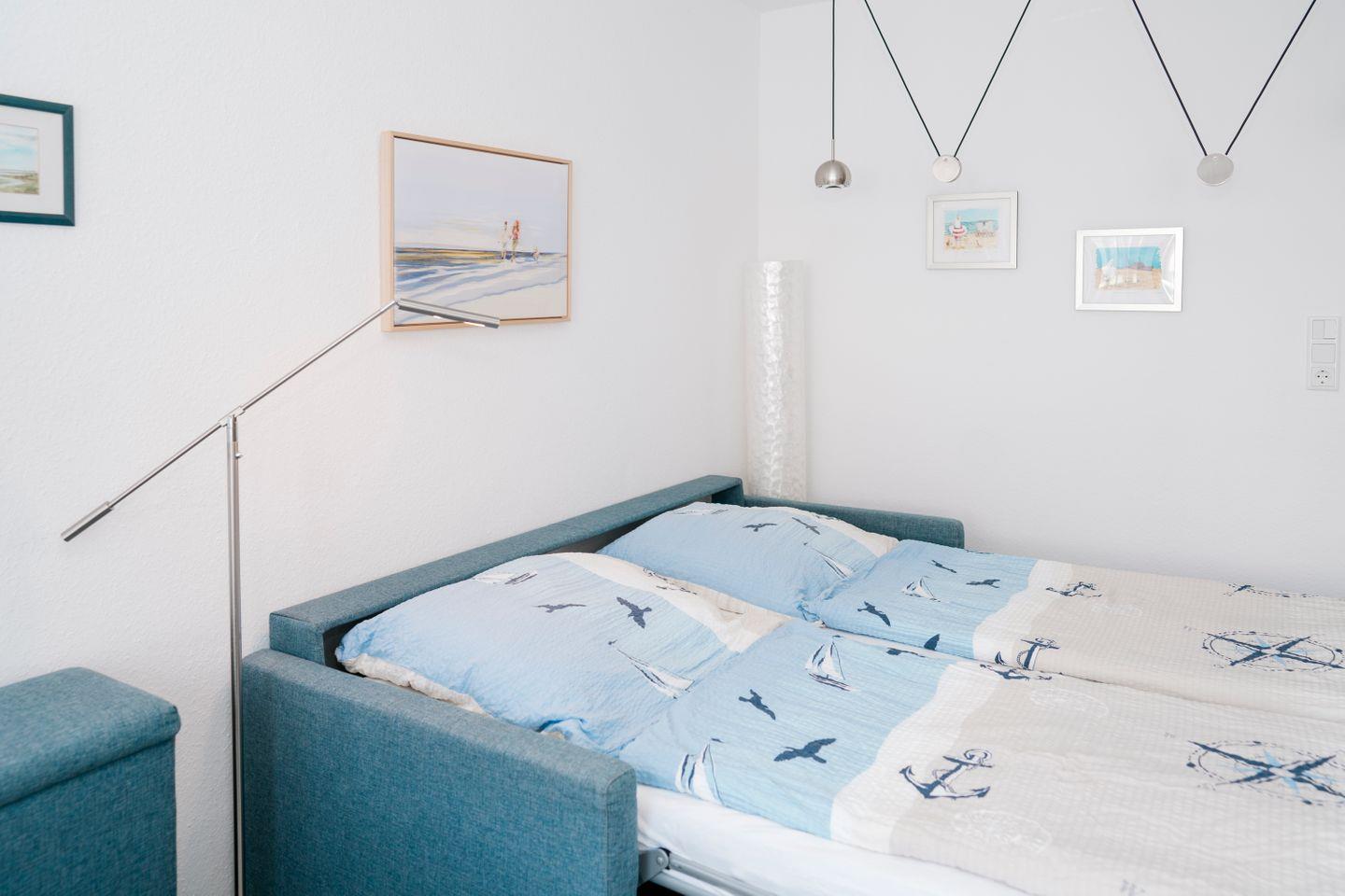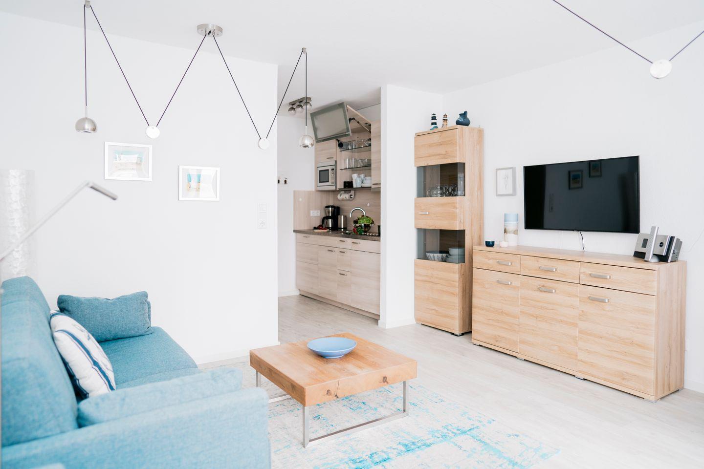 Der Wohnbereich ist mit einem komfortablen Schlafsofa (1,80 x 2,00 m) mit freiem Fußteil ausgestattet und bietet ausreichend Platz für bis zu 2 Personen. Ein Essplatz für 3 Personen, ein TV sowie eine Stereoanlage sorgen für zusätzlichen Komfort. WLAN steht kostenfrei zur Verfügung.