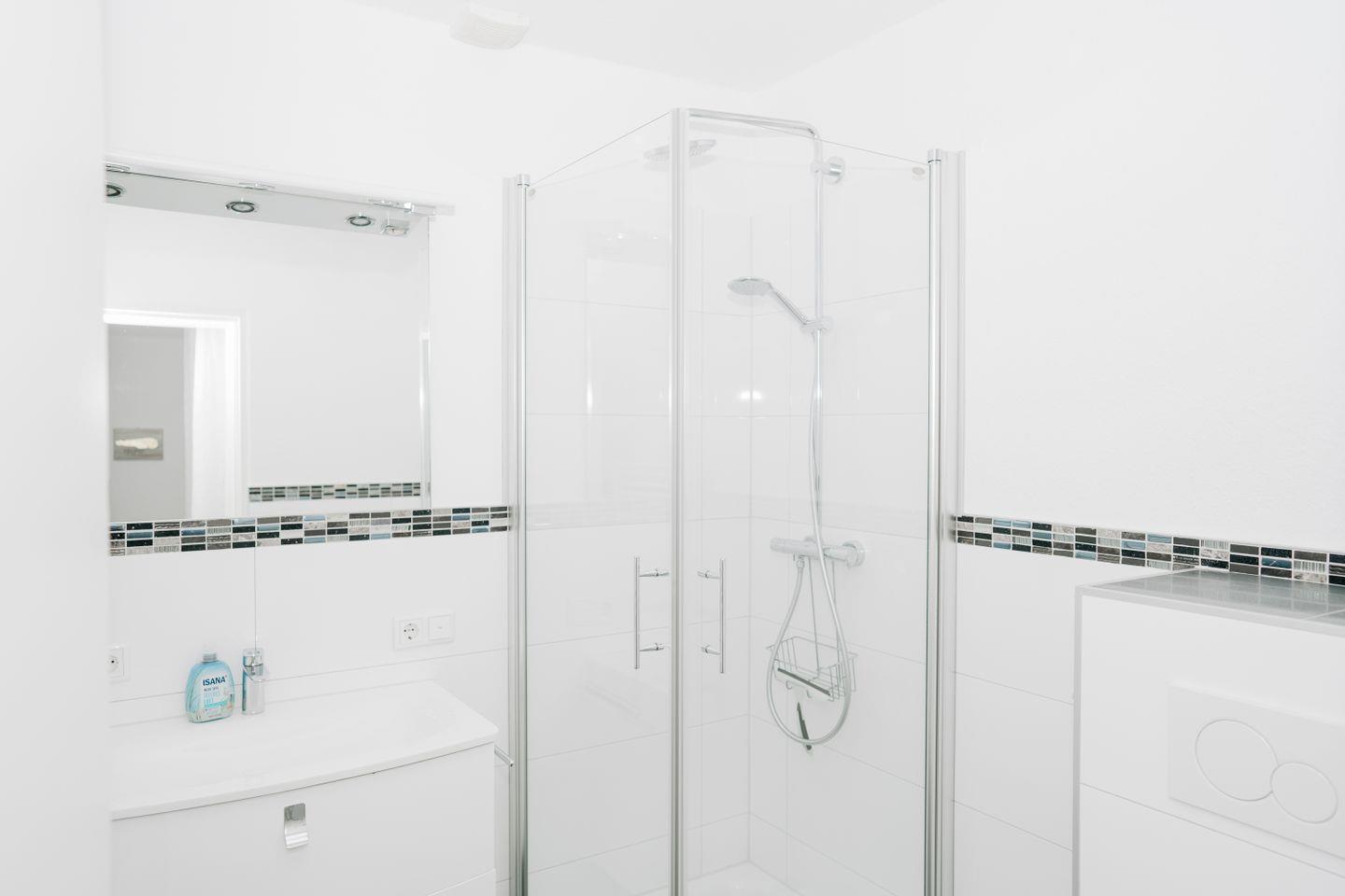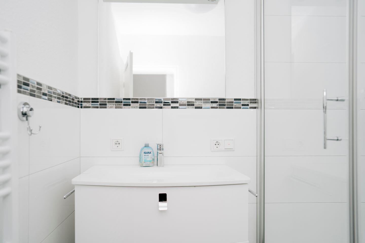 Das moderne Badezimmer verfügt über eine Dusche mit Regendusche und Handbrause, ein WC, einen Föhn sowie einen Handtuchtrockner – ideal für einen erfrischenden Start in den Tag.