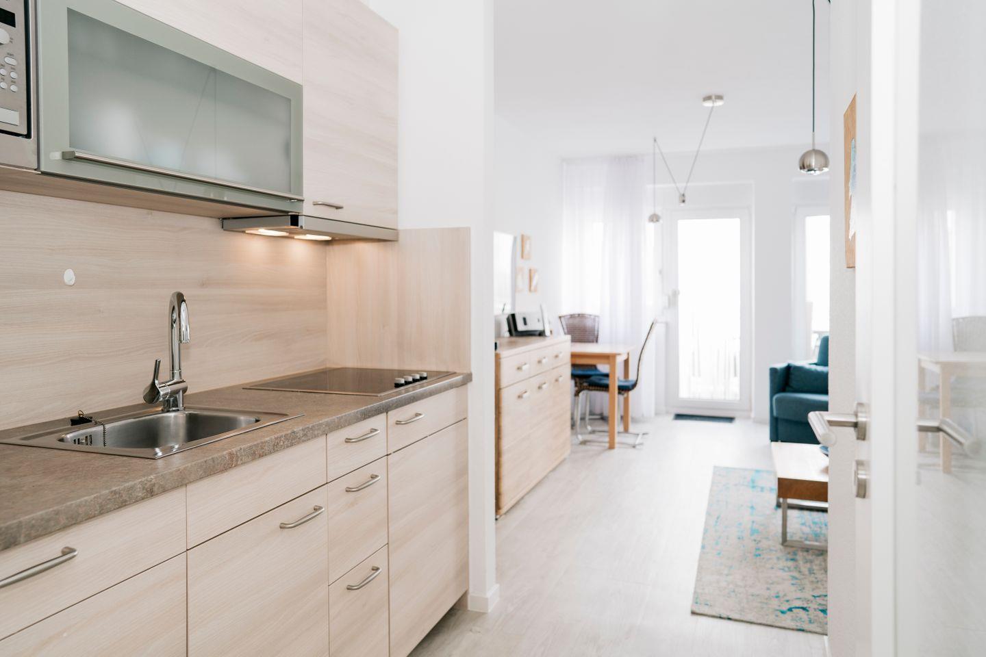 Diese modern eingerichtete 1-Raum-Wohnung befindet sich im 1. Obergeschoss und ist bequem über einen Aufzug erreichbar. Die frisch renovierte Wohnung besticht durch eine helle und freundliche Atmosphäre sowie eine gut ausgestattete, in den Wohnraum integrierte Küchenzeile mit einem 4-Platten-Ceran-Kochfeld, Mikrowelle, Geschirrspüler und Kühlschrank mit Gefrierfach.
