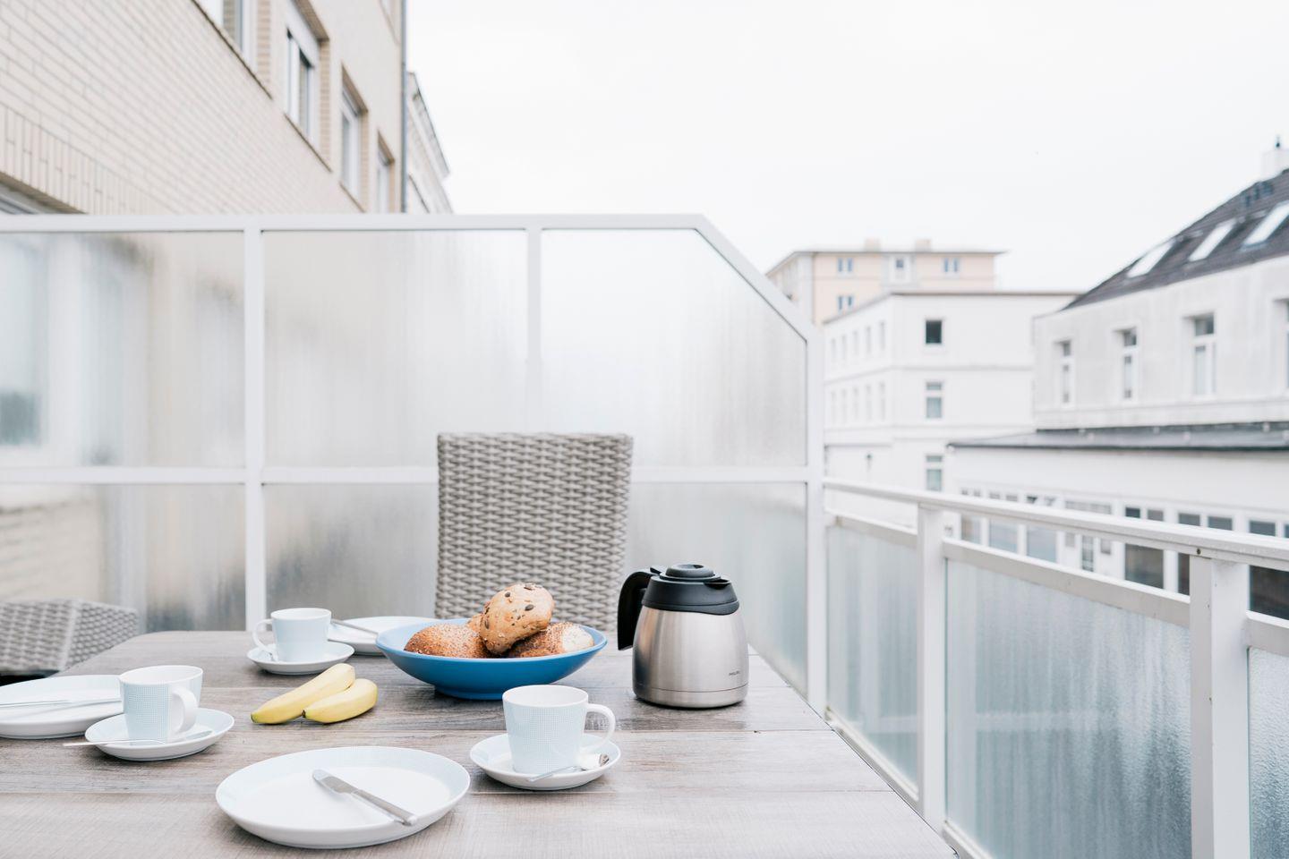 Ein besonderes Highlight ist der großzügige Balkon mit etwa 15?m², der mit schönen Gartenmöbeln zum Essen im Freien oder Sonnenbaden einlädt. Von hier genießen Sie einen seitlichen Meerblick und können entspannte Stunden an der frischen Luft verbringen.